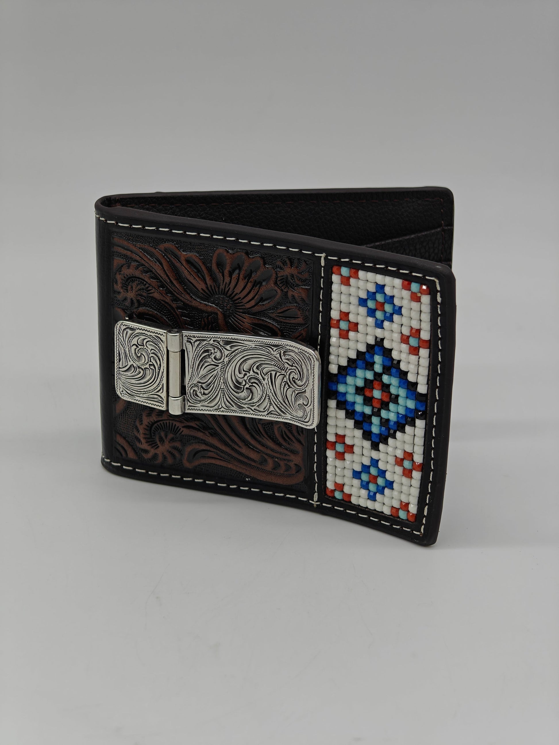 Decorative and stylish mens 3D bifold flip wallet. It is made of genuine tan leather with a hand tooled basket weave and sunburst design. There is an antique silver concho with a turquoise Cross in the center. Multiple card slots along with a cash slot, permanent pass case and ID window.
