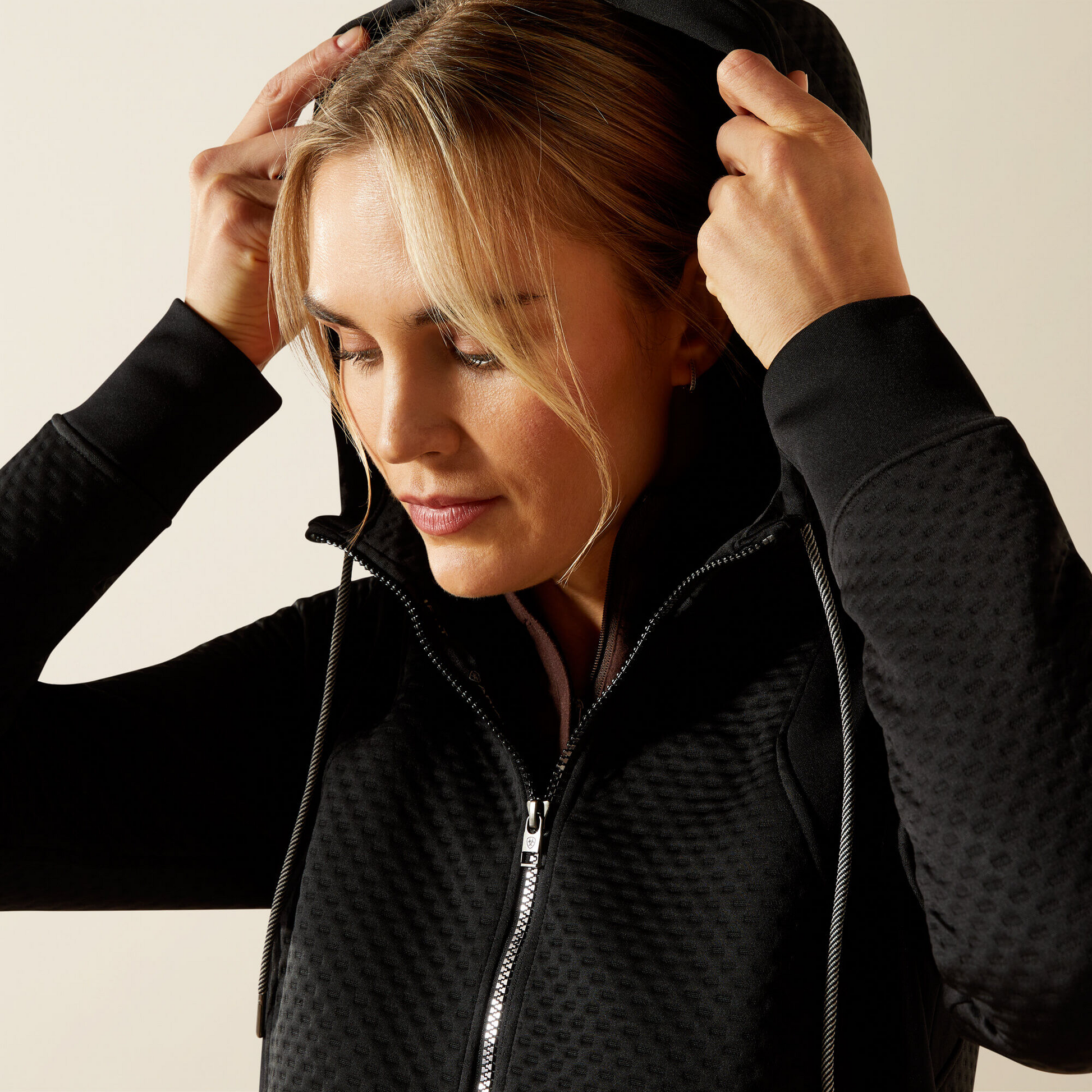 - Full-length front zip closure with hood