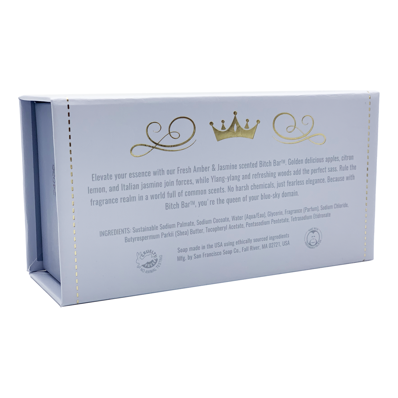 Elevate your essence with our Fresh Amber & Jasmine scented Bitch Bar. Golden delicious apples, citron lemon, and Italian jasmine join forces, while ylang-ylang and refreshing woods add the perfect sass. Rule the fragrance realm in a world full of common scents. No harsh chemicals, just fearless elegance. Because with Bitch Bar, you're the queen of your blue-sky domain.