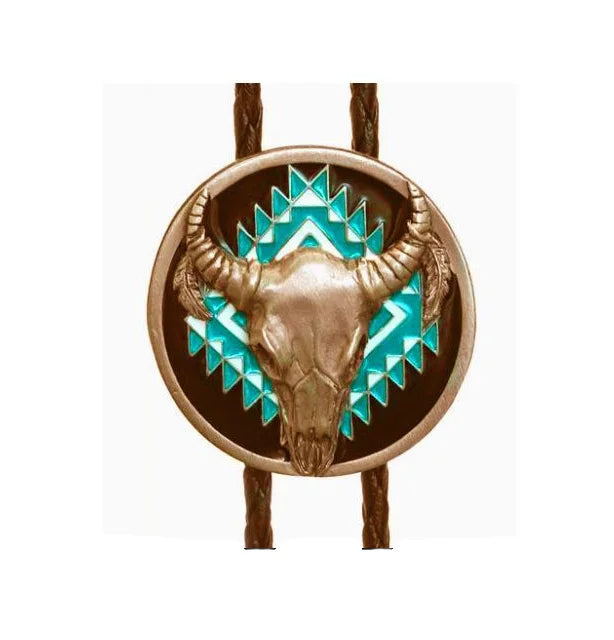 Steer skull with feathers bolo tie. Vintage style oval setting on a black leather lanyard. This bolo will add western charm to your wardrobe. Our western bolo tie will be the exact finishing touch your western fashion needs! This Turquoise and Silver Bolo Tie is the ultimate in a southwest accessory.