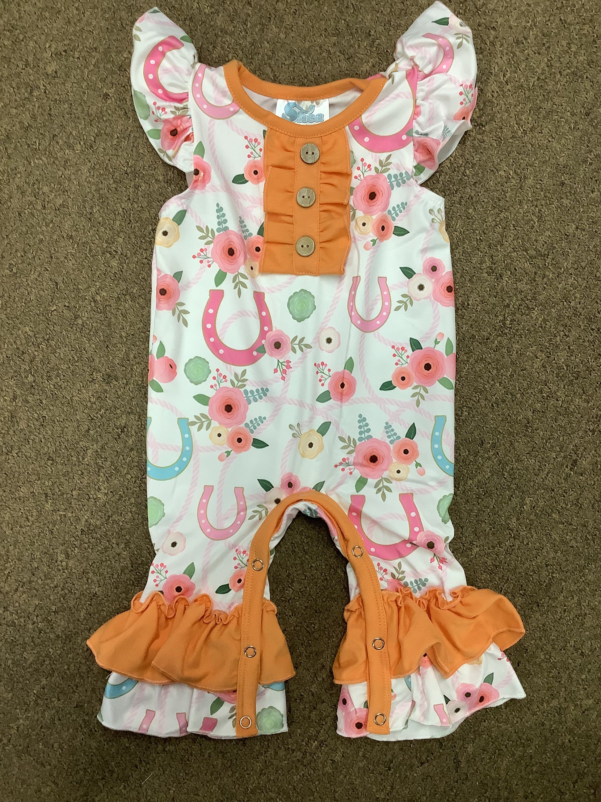 Floral Horseshoe sleeveless romper. Orange and pink 95% polyester 5%Spandex