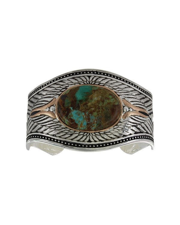 Montana Silversmiths brings you this charming Feathered Flight Turquoise women's cuff bracelet. The centerpiece of the wide bracelet is a variegated turquoise cabochon oval shape surrounded with lightly antiqued silver tiny feathers and delicate hand painted black lines. The edge of the bracelet has a smooth wire trim. Proudly Made in the USA. Bracelet is 99.9% fine silver and 14 karat rose gold plated over a brass base. The Montana Armor protective finish prevents tarnish.