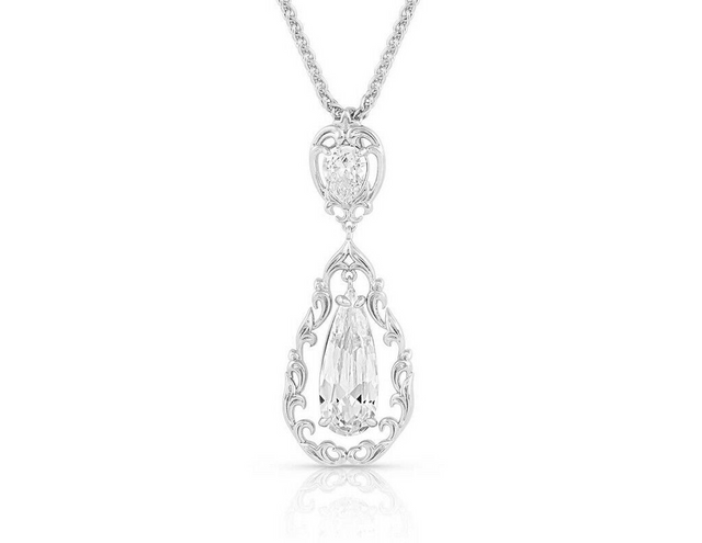 Womens Montana Silversmiths Necklace: Ladies Montana Silversmiths Western Necklace. Fit for royalty the design of the women's Princess Frost Crystal Necklace is elegant and dazzling. At the top of the necklace is a clear cubic zirconia stone enclosed by magnificent silver tone pieces. Dangling below is a lovely teardrop-shaped clear cubic zirconia stone surrounded by a striking silver-tone frame creating a regal design. The necklace is attached to a 19 inch silver-tone chain. Rhodium over a brass base.
