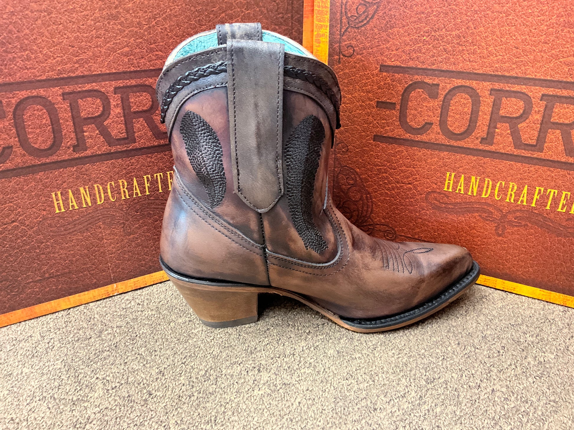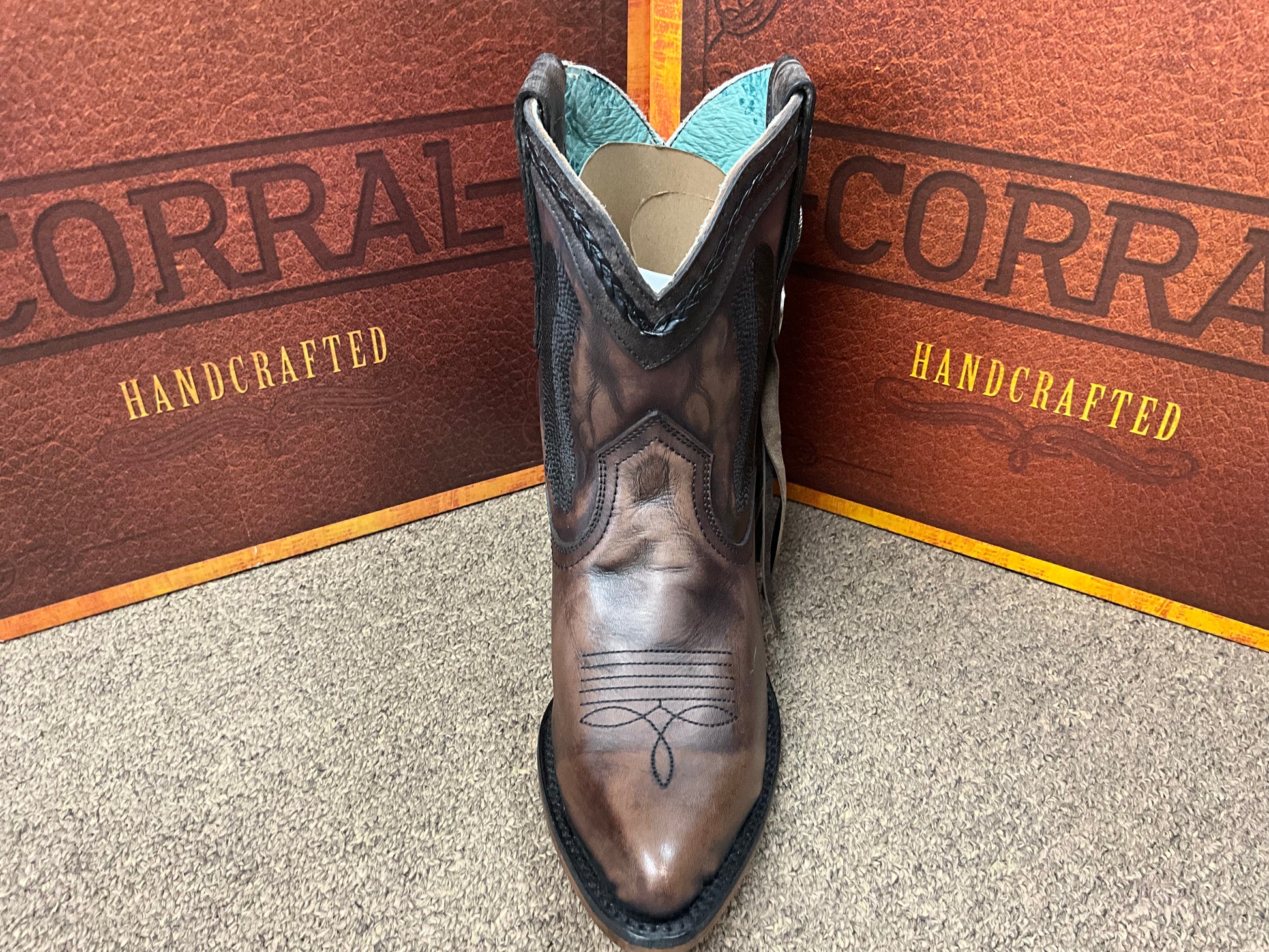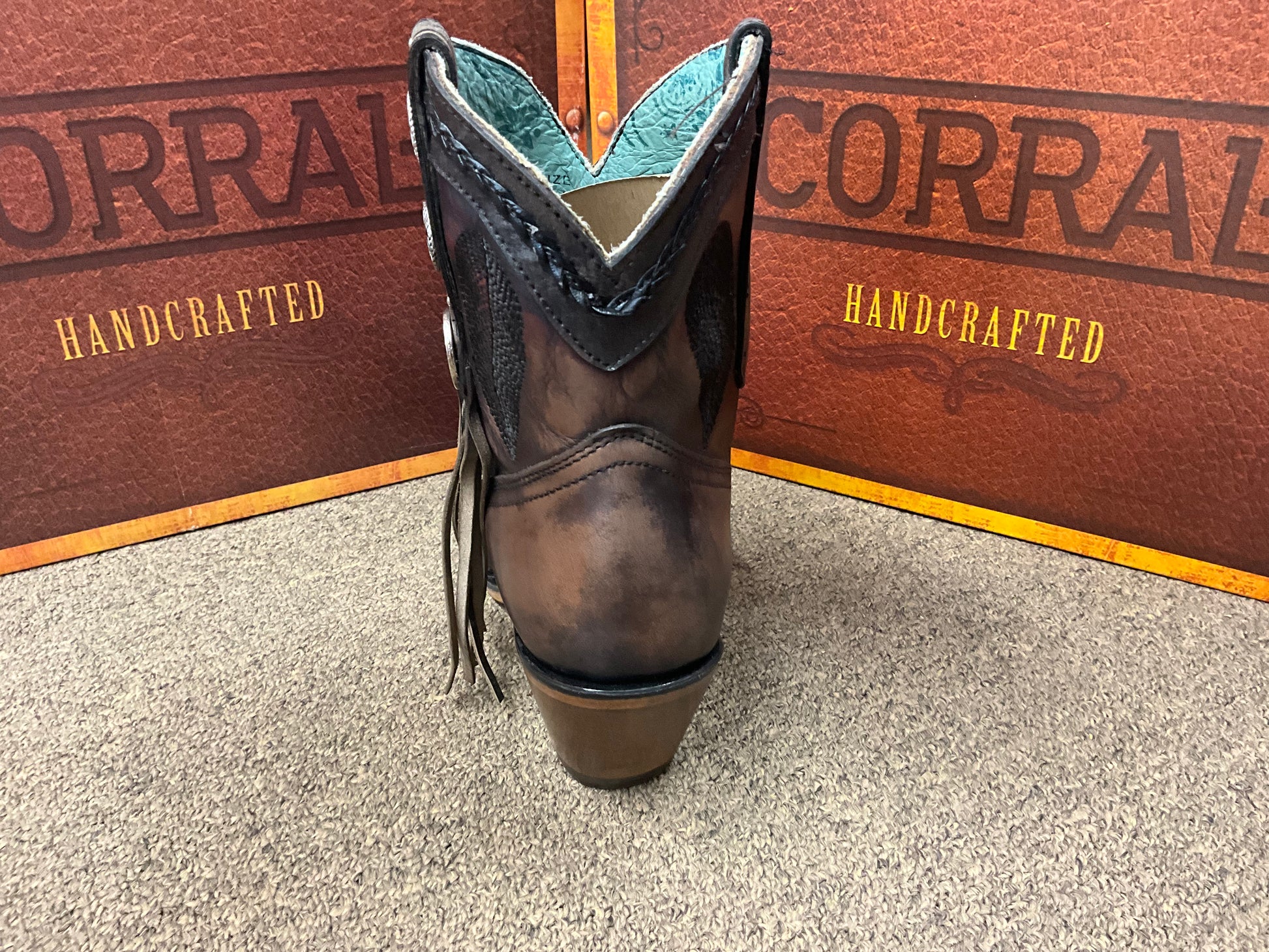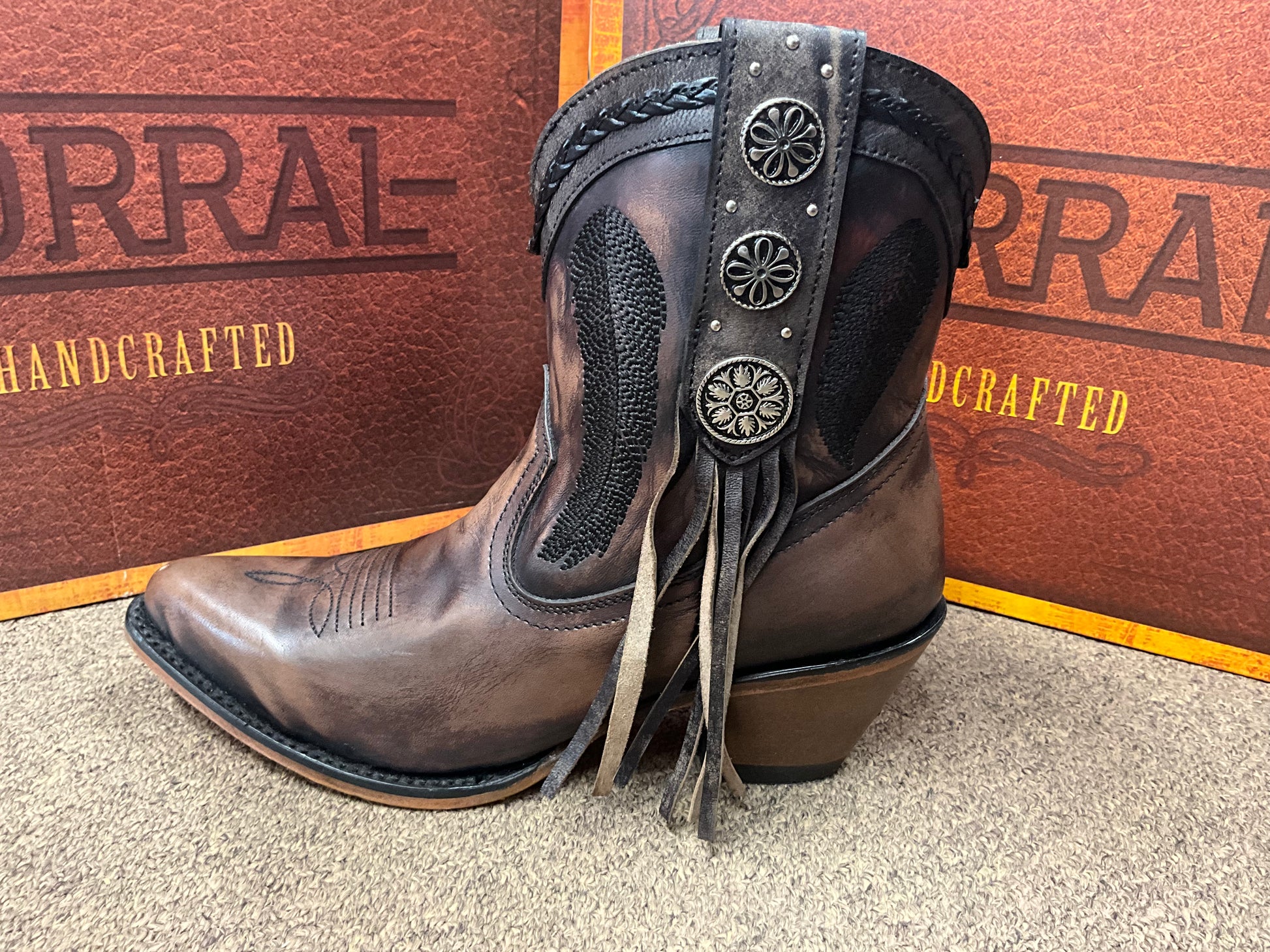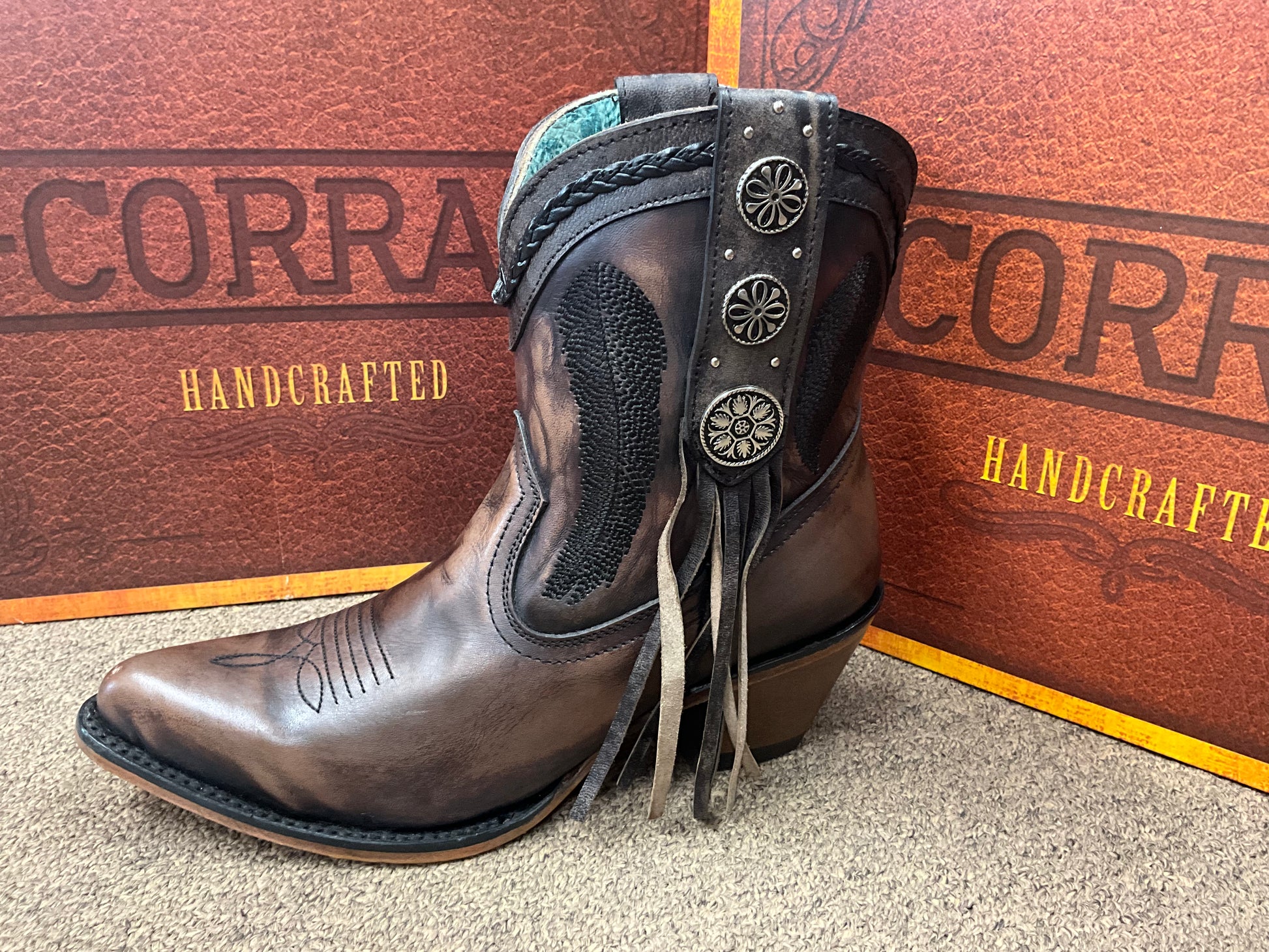Look stylish while staying comfortable in these 7.5" Women's Western Boots by Corral. Featuring an elegant brown embroidery pattern, conchos and with leather lining and cushioned insole, these boots will add charm to any outfit. The 2" tacked heel and rubber heel cap offer all-day comfort.