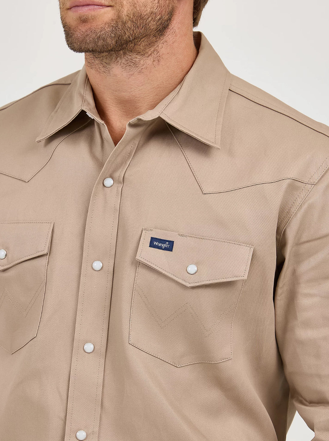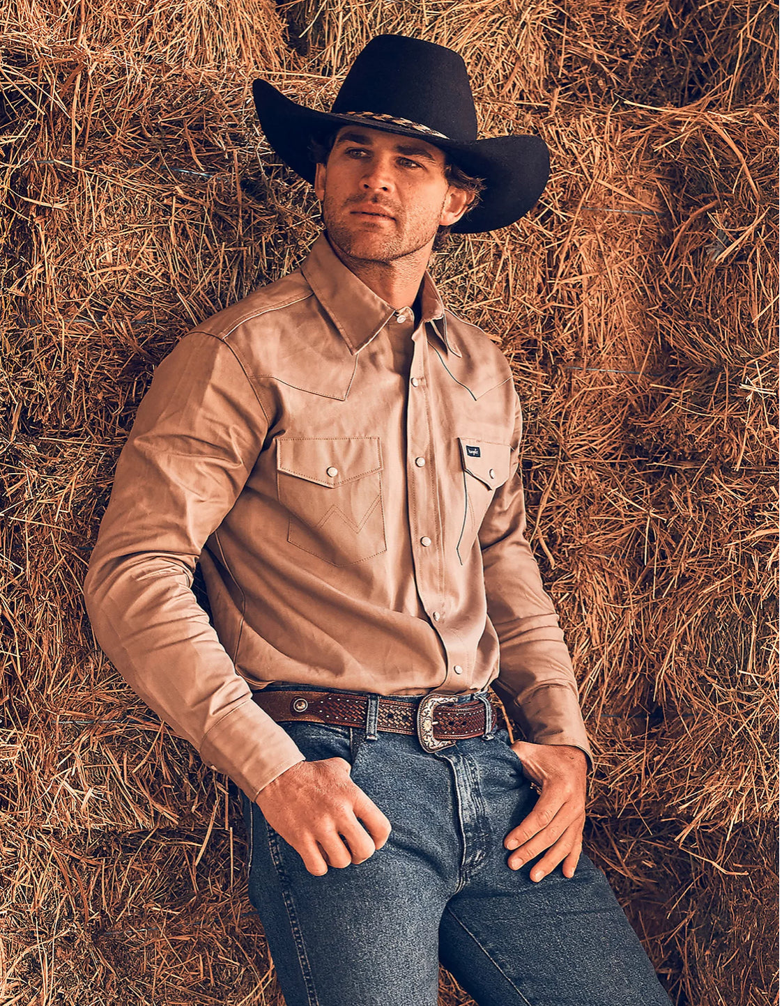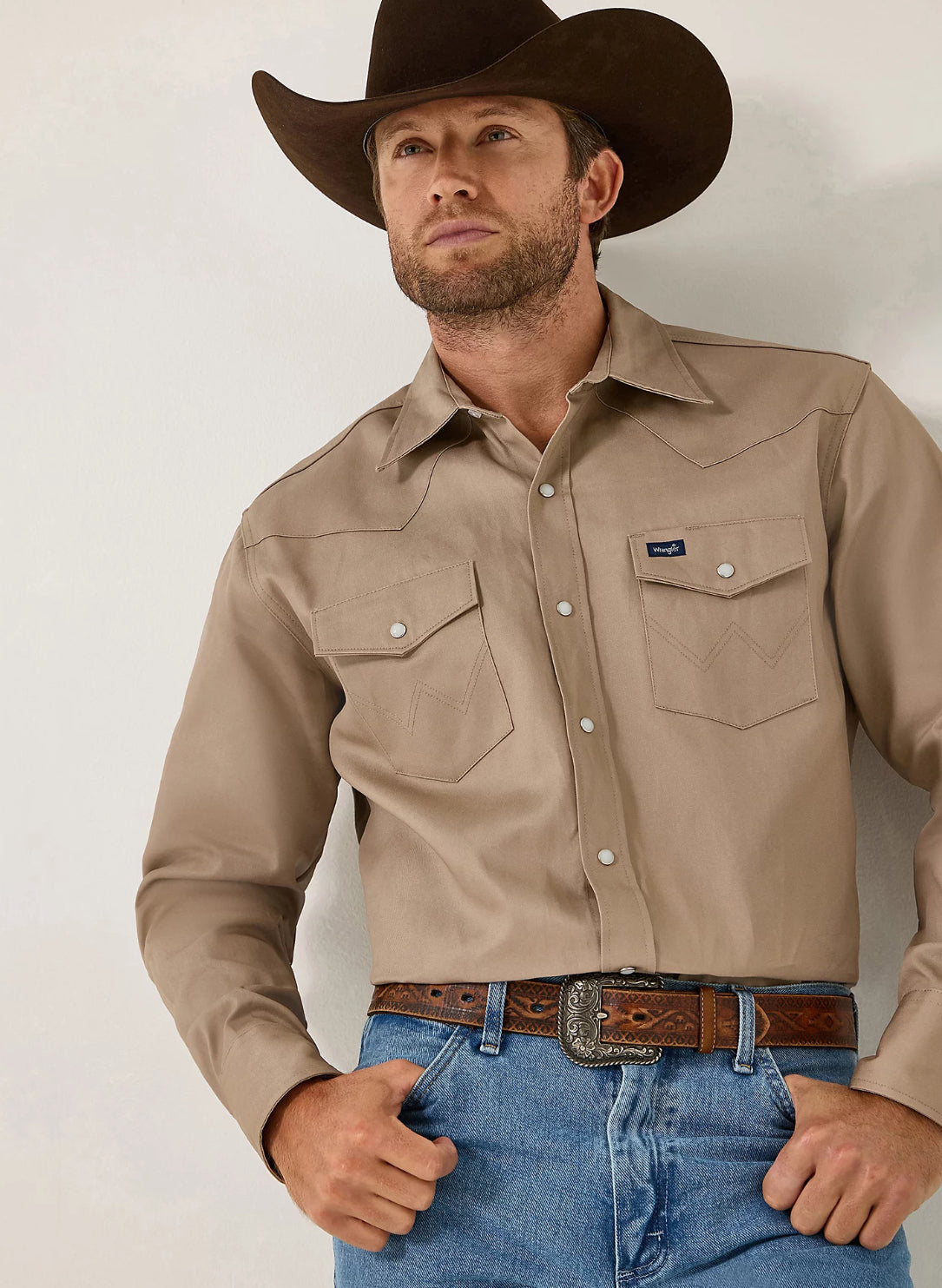 When the going gets tough, you'll be glad to know this shirt has your back. Wrangler® work shirts are a cut above the rest and they have certainly earned their credentials in the eyes of cowboys across the country. These hard-working wardrobe essentials come complete with all the authentic details you know and love about Wrangler® Western shirts, including a spread collar and spade flap snap pockets with snap closure as well as Western-inspired front and back yokes. But we didn't stop there. Wrangler® Cowboy Cut® shirts also come with a convenient pencil slot and the iconic Wrangler® logo riser label on the left pocket. Plus, men's Cowboy Cut® firm finish work shirts feature a rigid look and feel that will last wash after wash.