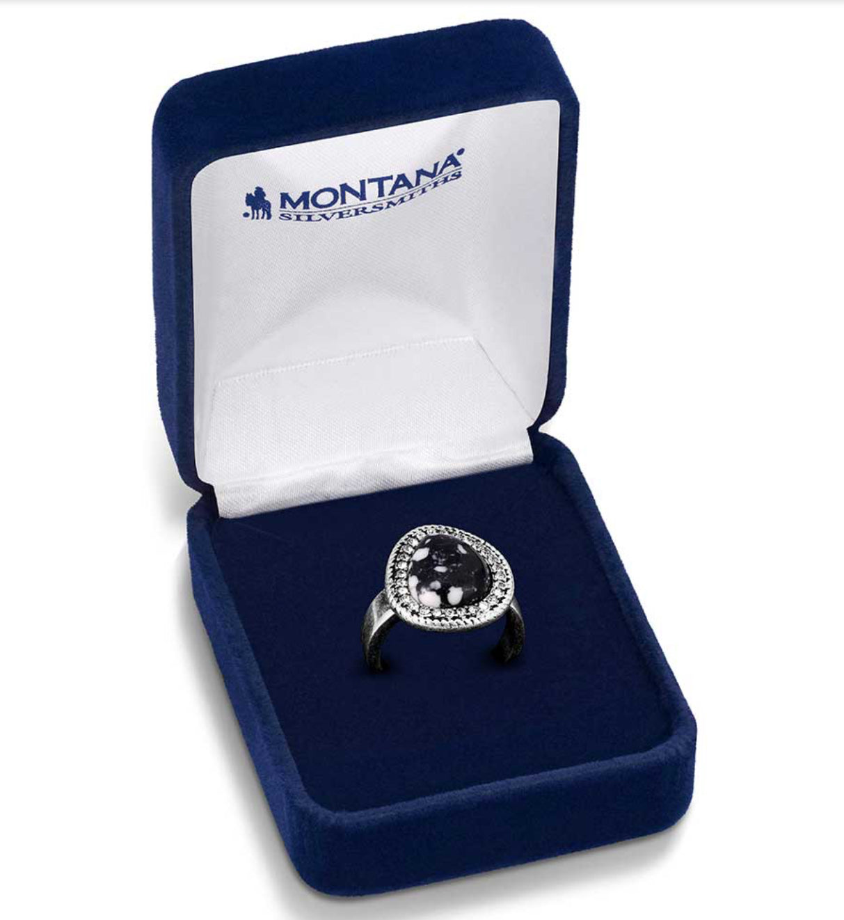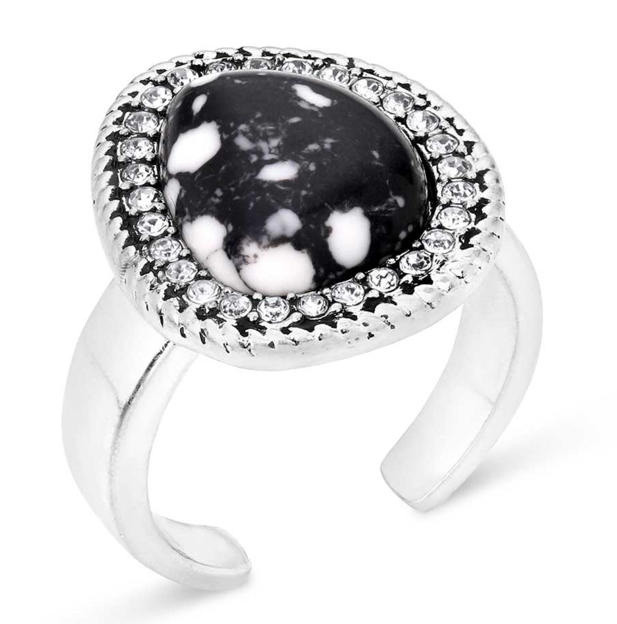 This ring is sure to add some spice to any outfit. The Dark and Stormy ring features a crafted black and white howlite stone that is surrounded by clear cubic zirconia crystals. The stone is attached to a silver tone band with an open back for adjustable sizing. Stone colors may vary.