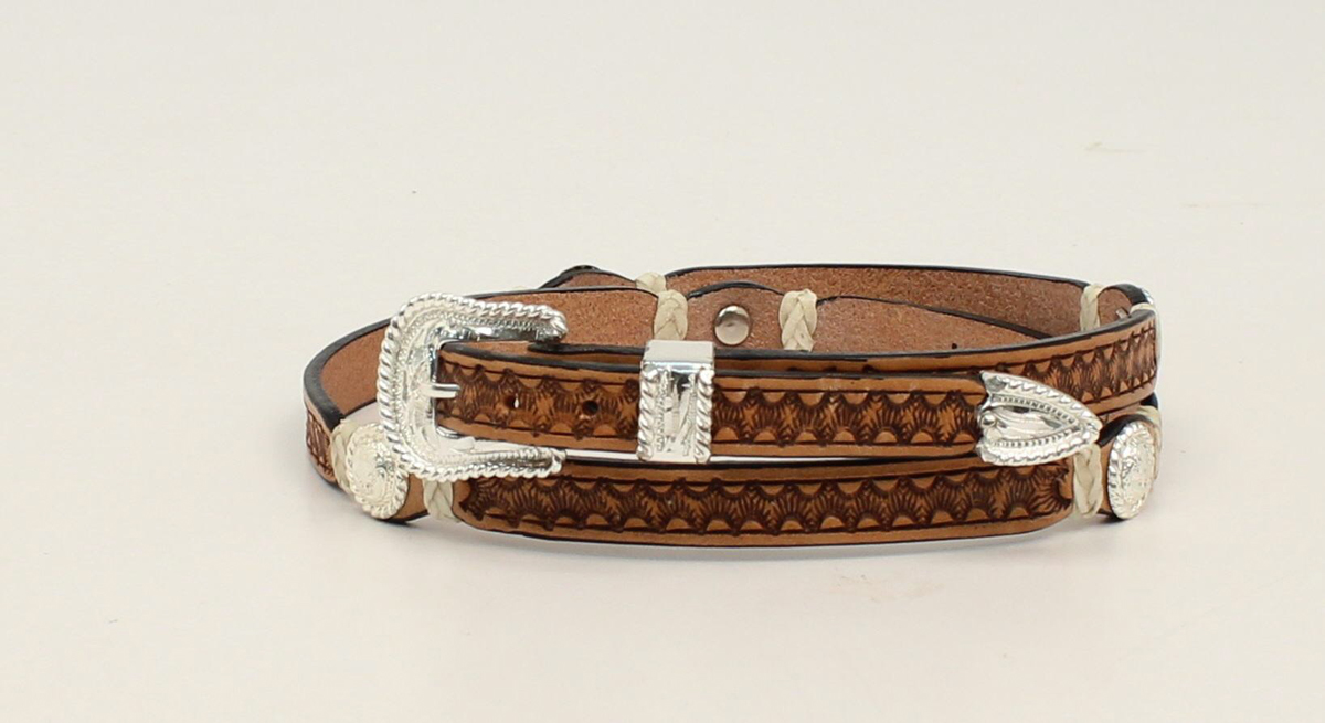 This leather hatband by M&F Western Products will definitely set off the western look on your favorite hat. This hatband displays a stamped leather pattern on the band with a rawhide braid on each side of a beautiful concho.