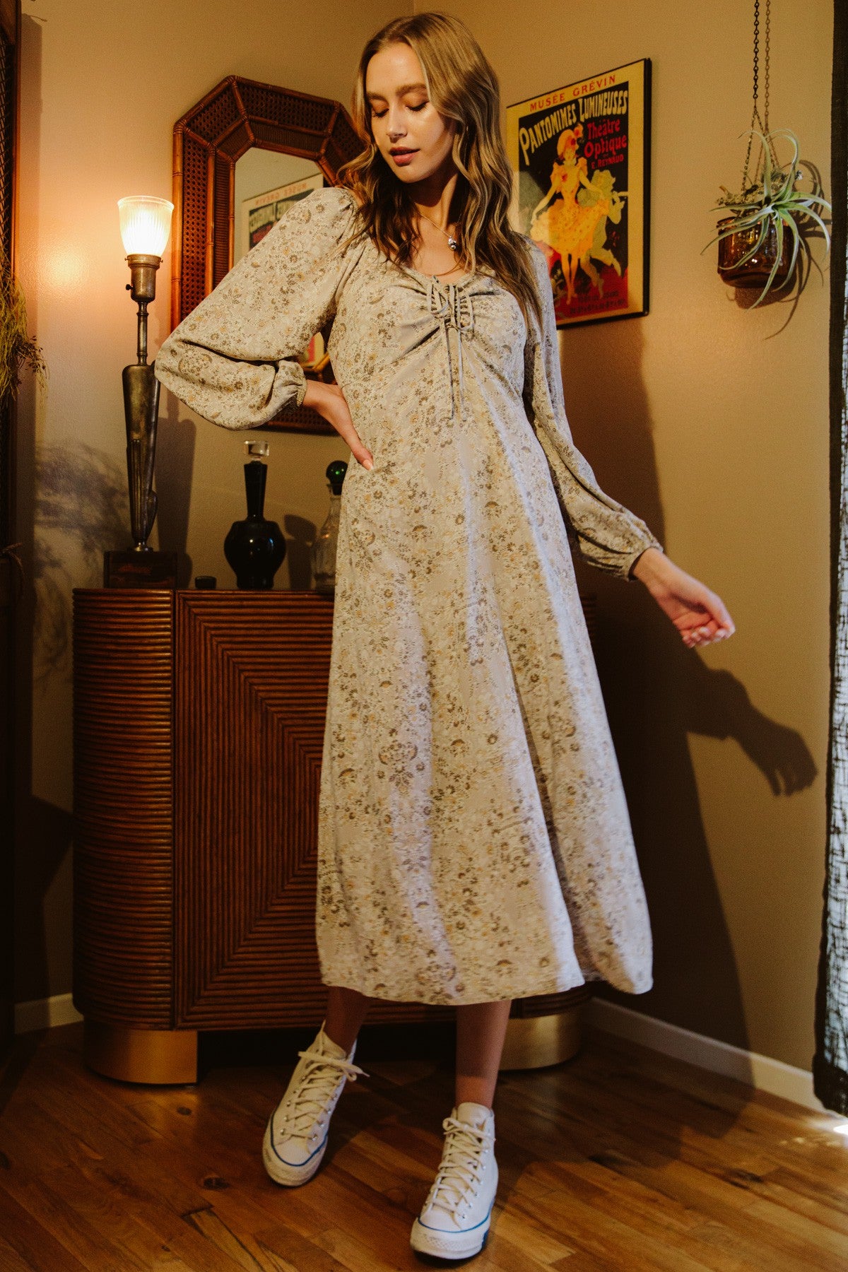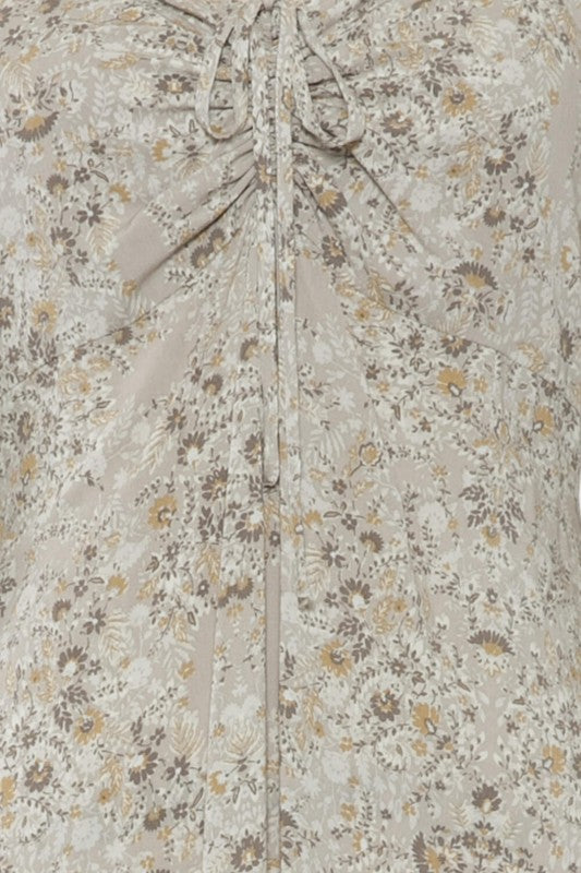 FLORAL PRINTED SHIRRING AND TIE DETAILED WITH BACK SMOCKED LONG SLEEVE MAXI DRESS. 100% RAYON POPLIN PRINT
