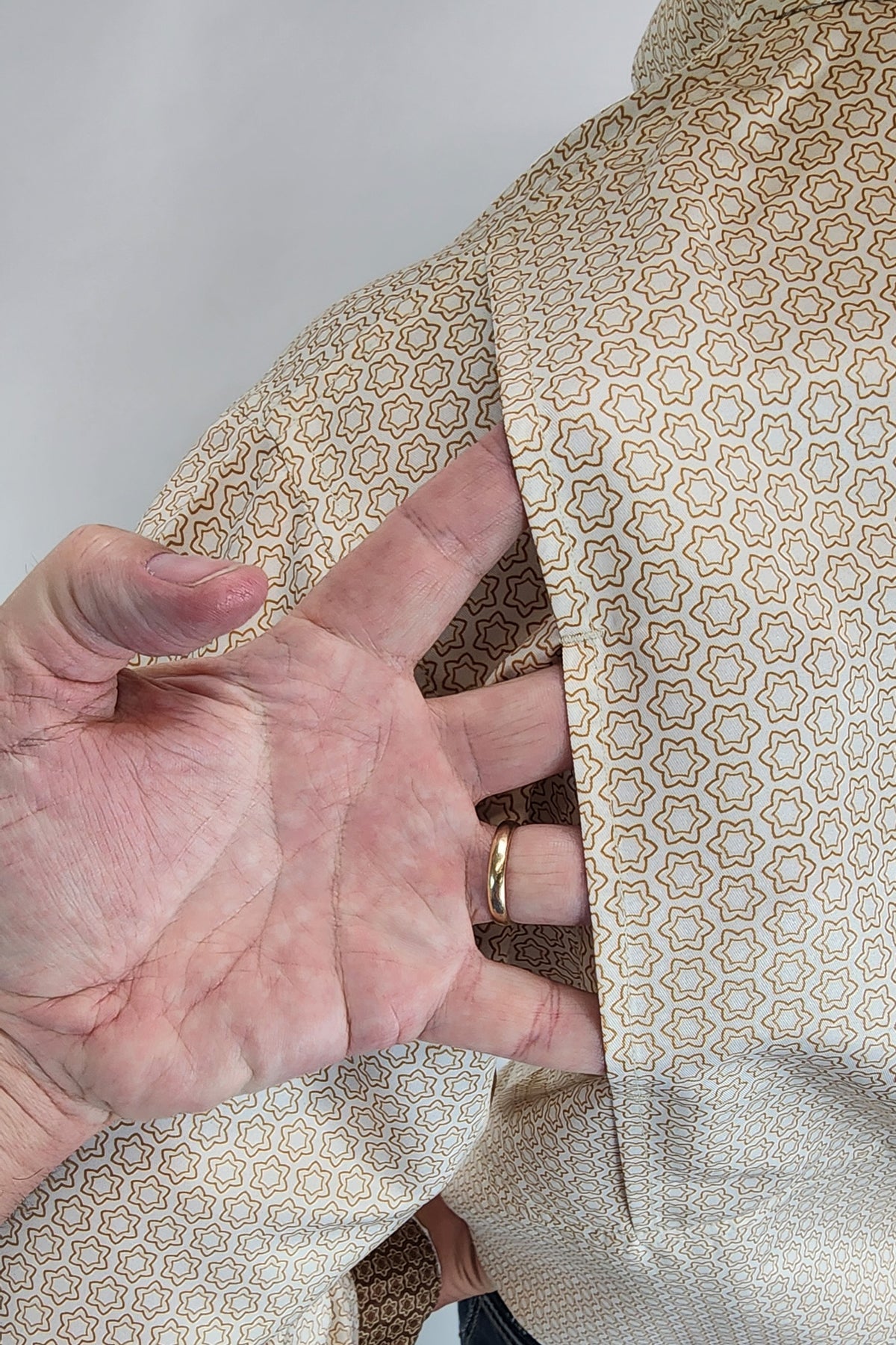 Mens long sleeve mustard and brown cuffs. Cool vents on back.