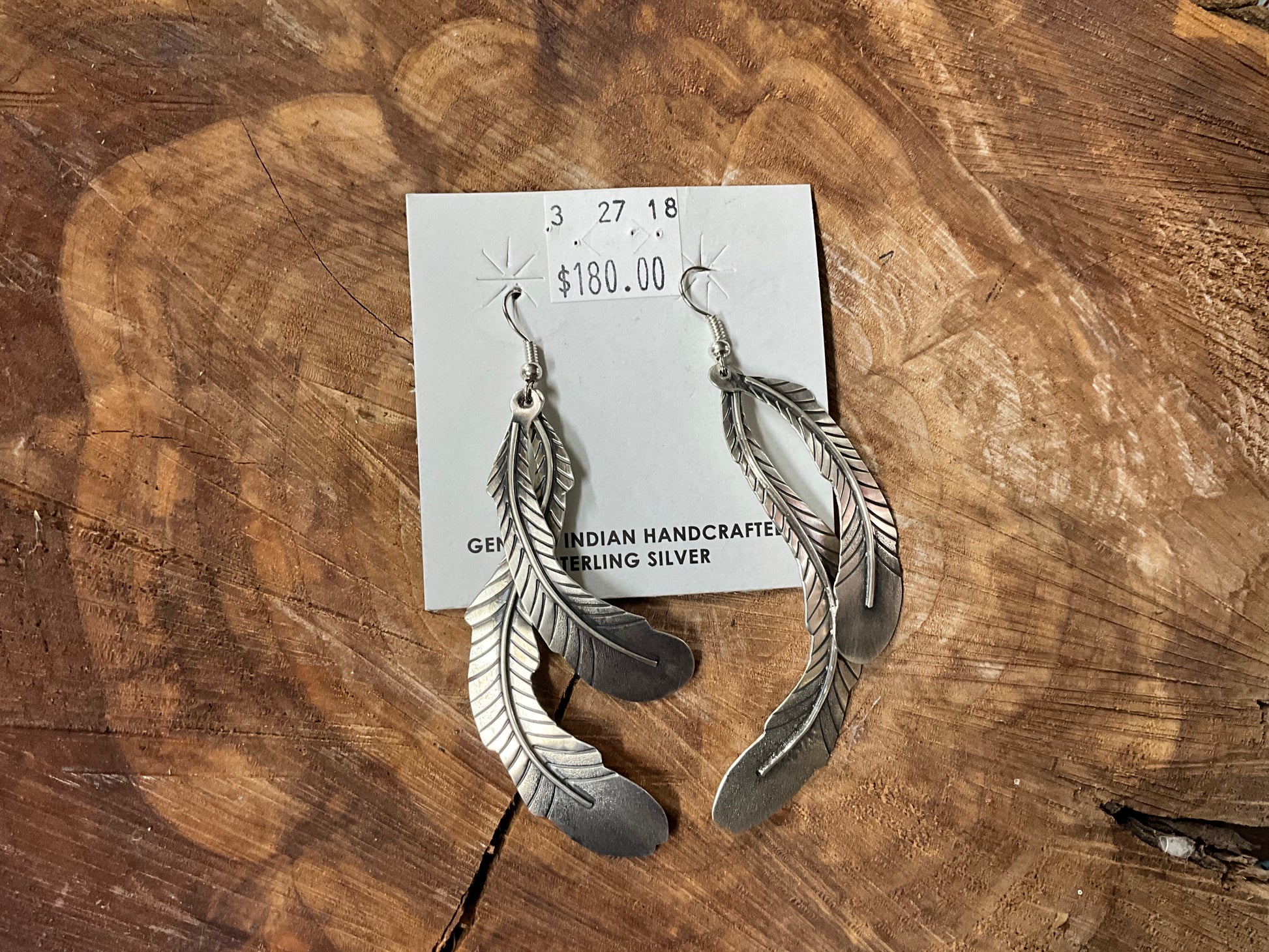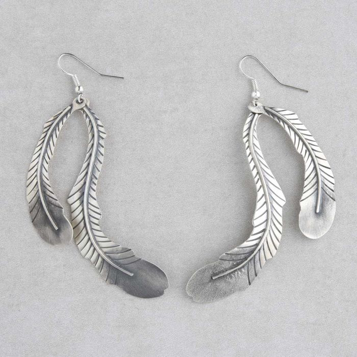 Contemporary style! Hand-stamped sterling silver feather earrings with intricate detail by Navajo silversmith Tawney Cruz.