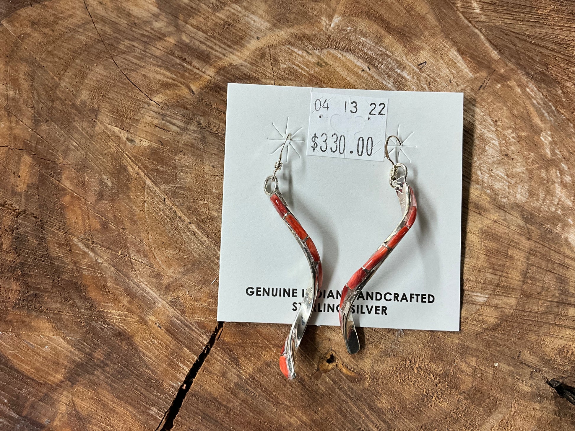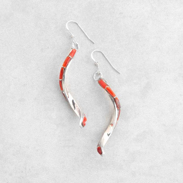 Handmade sterling silver earrings with a modern twist design. Featuring an inlay of vibrant Spiny Oyster Shell.