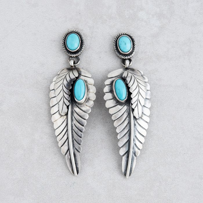 Sterling silver feather earrings with Campitos Turquoise accents. Handmade by Diné silversmith Herbert Spencer.