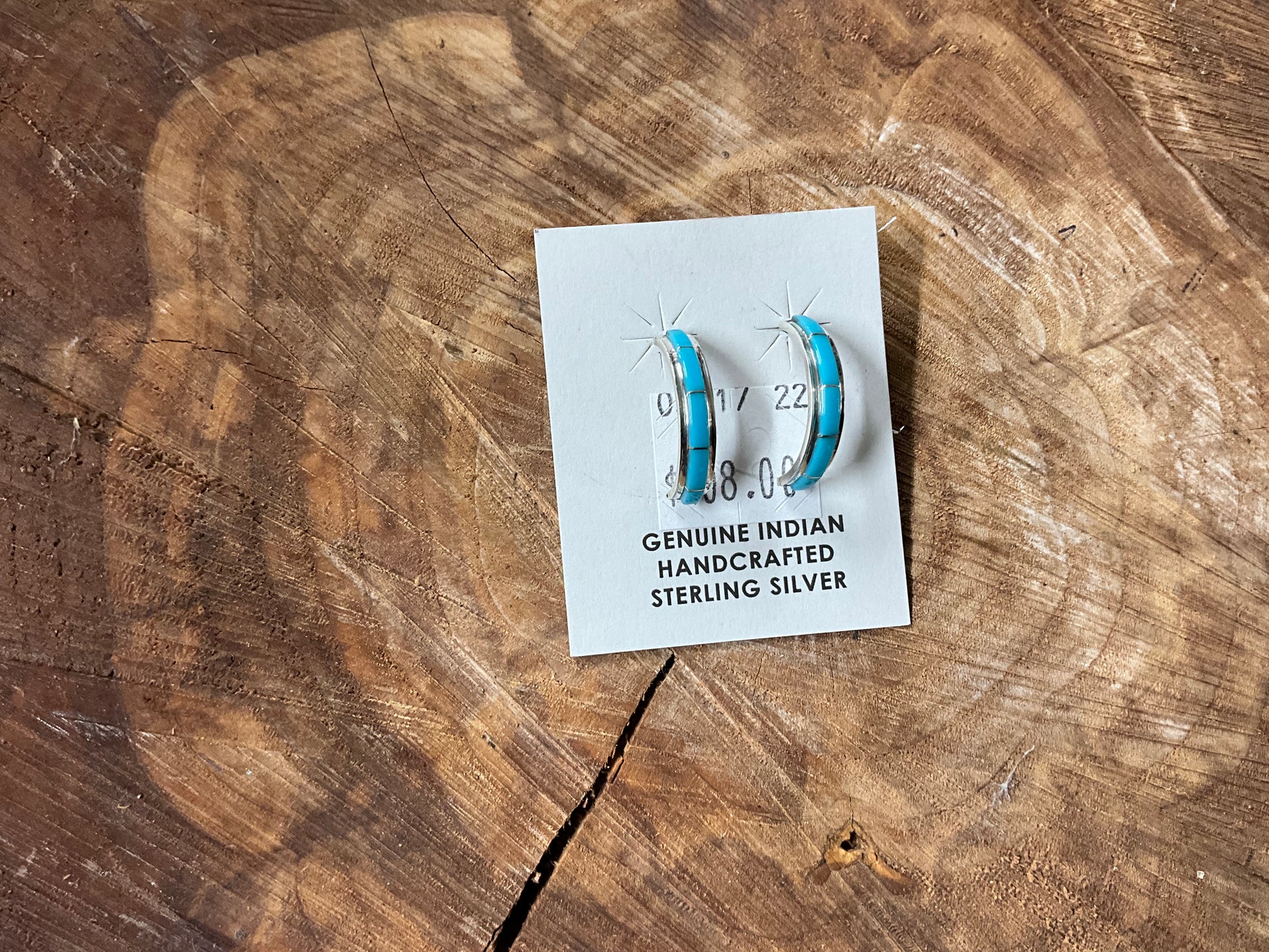 Sterling silver inlay hoop earrings with post, featuring Kingman Turquoise from Arizona. Southwest style staple!