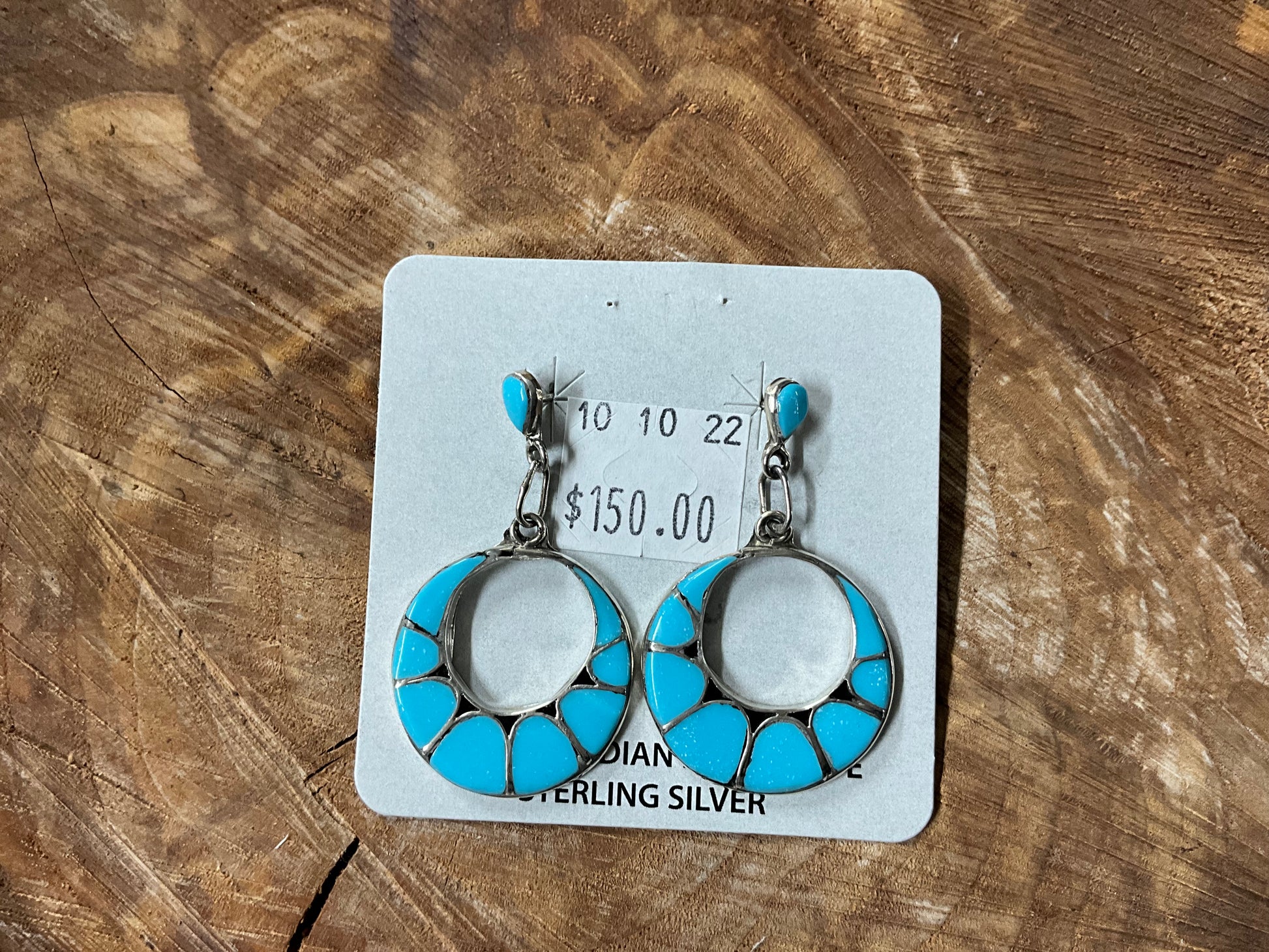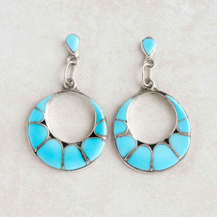 Sky blue inlay earrings that combine traditional Zuni work and playful contemporary style. Featuring Sonoran Beauty Turquoise, these lovelies are handmade by Zuni silversmith, Laurenda Bobelu.