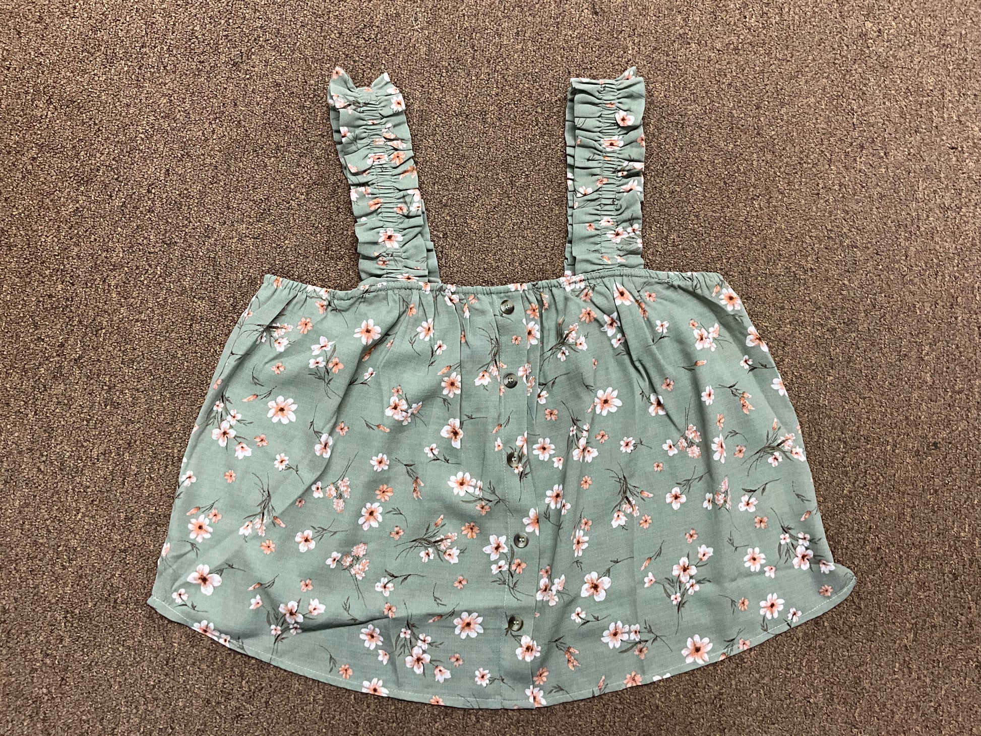 Square Neck Ruffle Strap Front Button Closure Tank Top Sage Green Peach Flowers