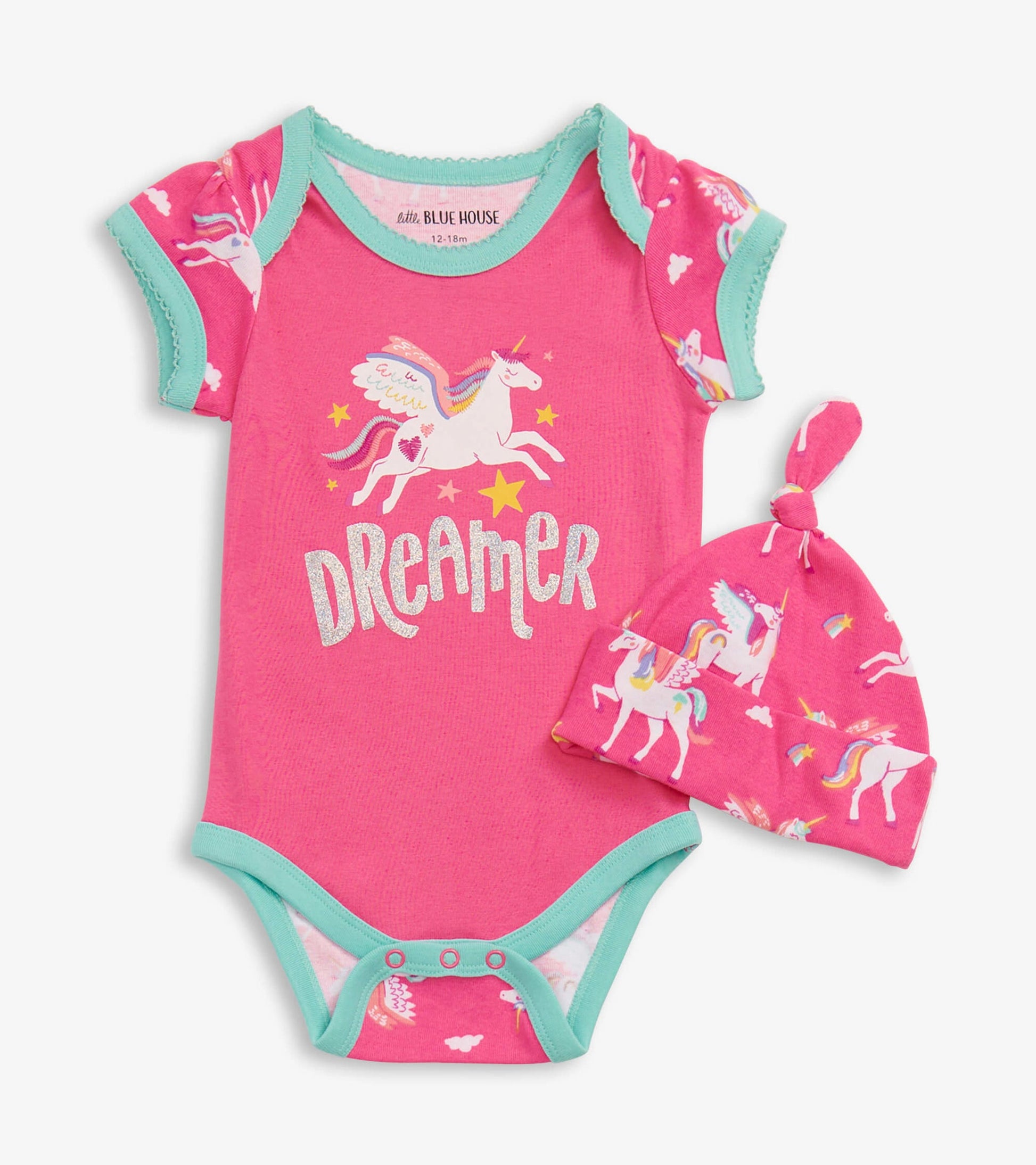 The perfect outfit for your little adventurer, this cotton bodysuit features a 3 snap closure for easy changing, a unique print and an adorable matching hat, making it just what they need for comfort that will last through the day!