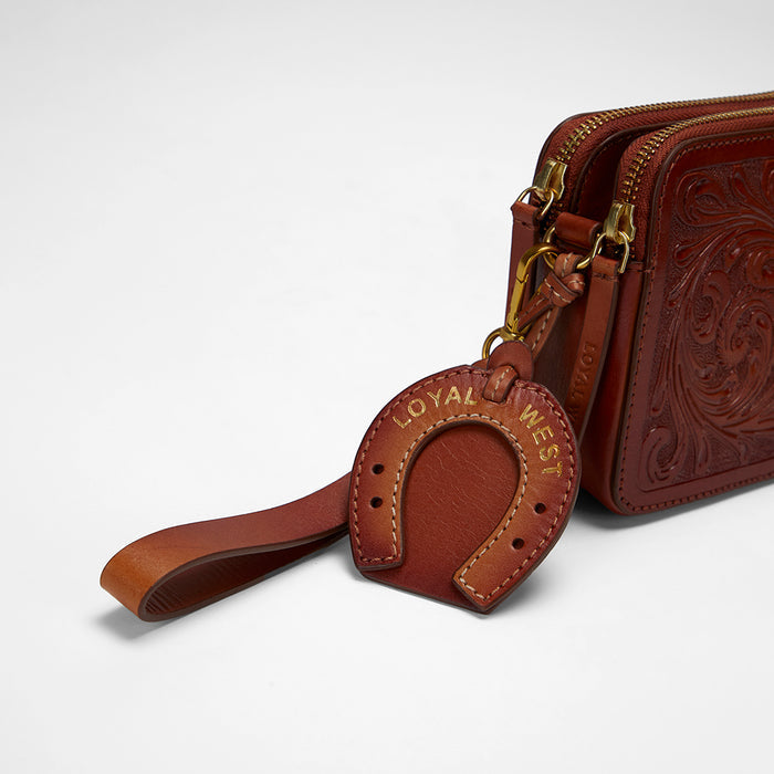 The Shell Mini Purse in handtooled leather exudes artisanal craftsmanship and timeless elegance. The intricate hand-tooled designs on the rich leather surface create a one-of-a-kind texture, offering a sophisticated yet rustic appeal. With its sleek crossbody silhouette, this bag is as functional as it is beautiful.