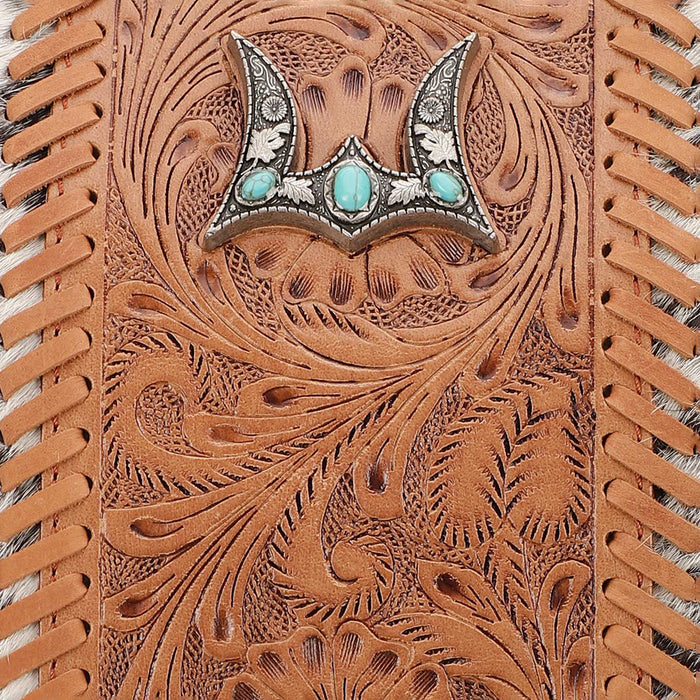 The Tucson Cowhide Tassle Bag is a stylish crossbody crafted from hair-on cowhide and smooth calfskin. Featuring handtooled detailing on the flap and playful frenzies, this bag offers a unique, boho-chic appeal.