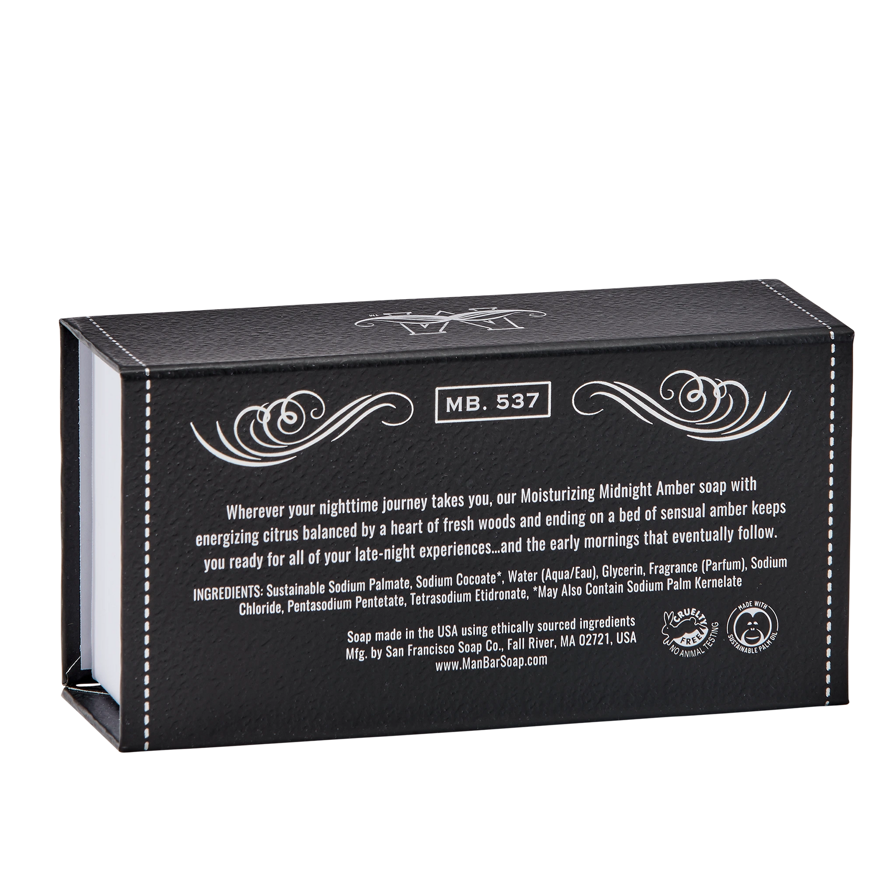 Wherever your nighttime journey takes you, our Moisturizing Midnight Amber soap with energizing citrus balanced by a heart of fresh woods and ending on a bed of sensual amber keeps you ready for all of your