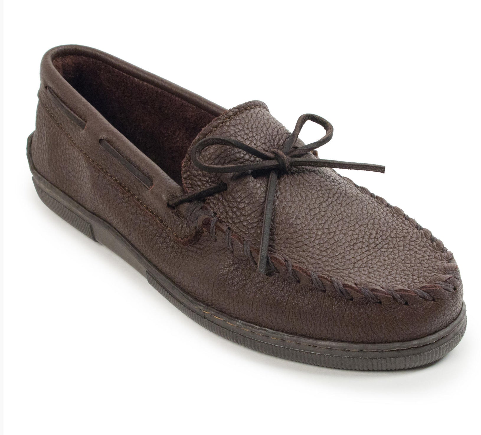 Combine the stylish, timeless design of a loafer with the durable construction of thick and genuine moosehide and you get these incredible moccasins. Soft and supple moosehide provides a super comfortable feel. A lightweight rubber sole gives these men’s moccasins just enough flex. Perfect with khakis for the office or shorts or jeans for a more casual look, these versatile moccasins will be a go-to favorite for a long time to come.