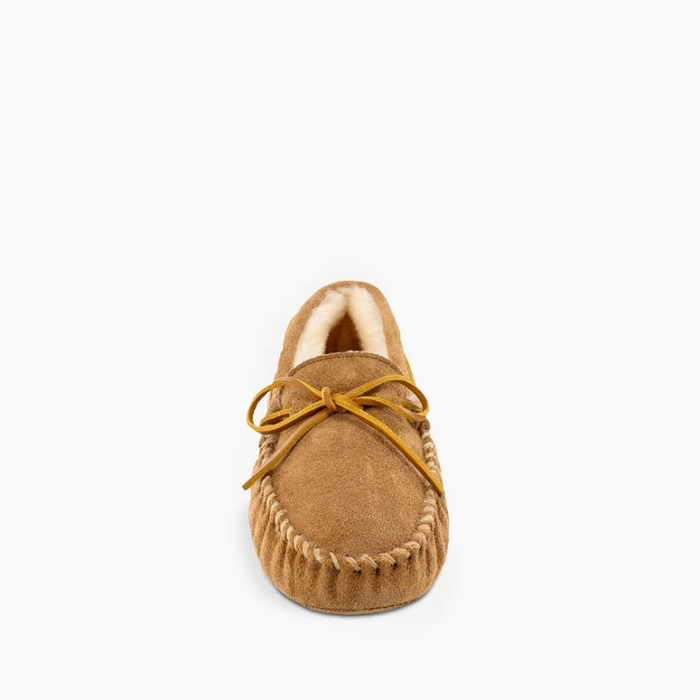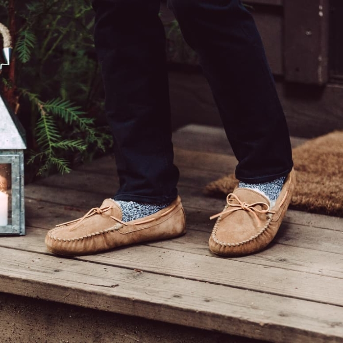 Sink into these men’s slippers after a long day and they’ll feel like blankets for your feet. The soft sheepskin lining keeps feet warm while wicking away moisture from your skin, keeping you dry and comfortable. Rawhide lacing keeps these slippers in place. The traditional softsole moccasin design makes these sheepskin slippers an absolute treat.
