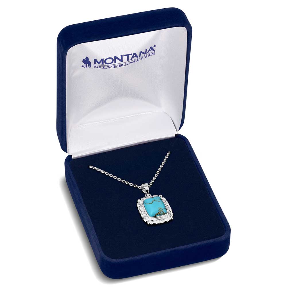 This simple pendant necklace will perfectly complement any outfit. The square turquoise stone is the center of the design. Surrounding the stone is a simple silver tone border with a scalloped edge creating a unique look. The square pendant is secured by a 20 inch silver tone chain. Stone color may vary.