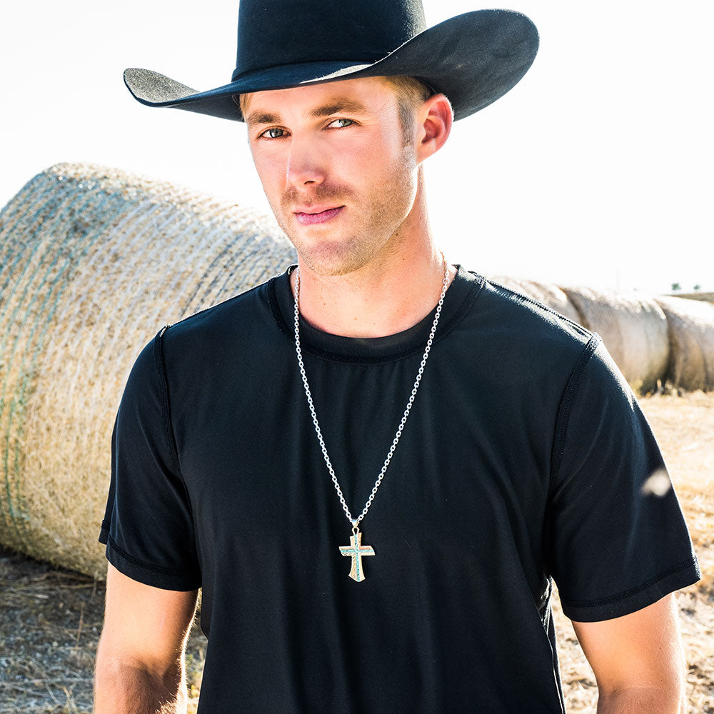 The Inner Light Turquoise Cross Necklace has a turquoise cross at its center. It is radiating between silver tone pieces that have a mix of feathering and filigree etches. The craftsmanship of the detail in this necklace is brilliant. The upper right corner of the cross is copper-toned for an even more radiant look. It is suspended from a 28 inch linked chain.