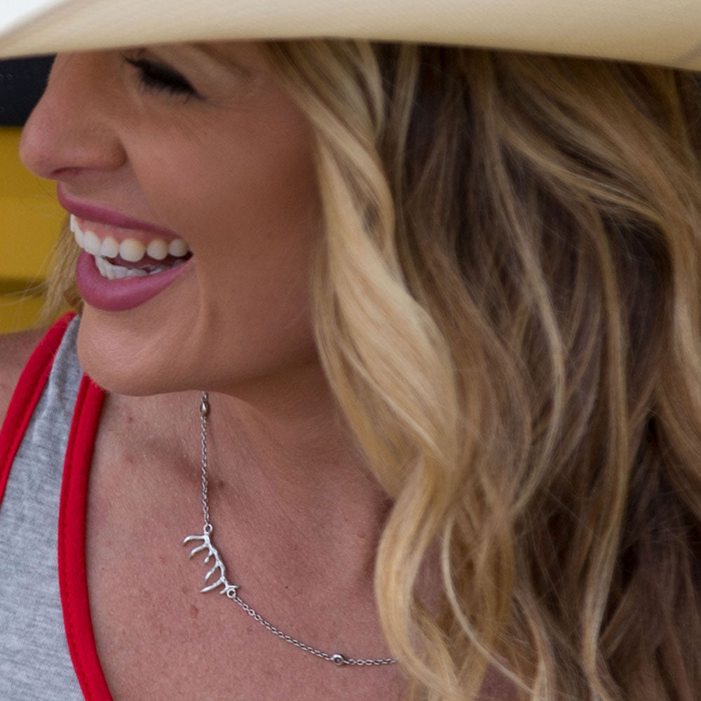 A part of the Pursue the Wild Collection with Kristy Titus. A delicate chain necklace with three round brilliant Zirconia set within the chain with a bright solid sterling antler placed off to the right of center to lay against your neckline for a beautiful accent. Necklace is a princess length 19 inch chain.