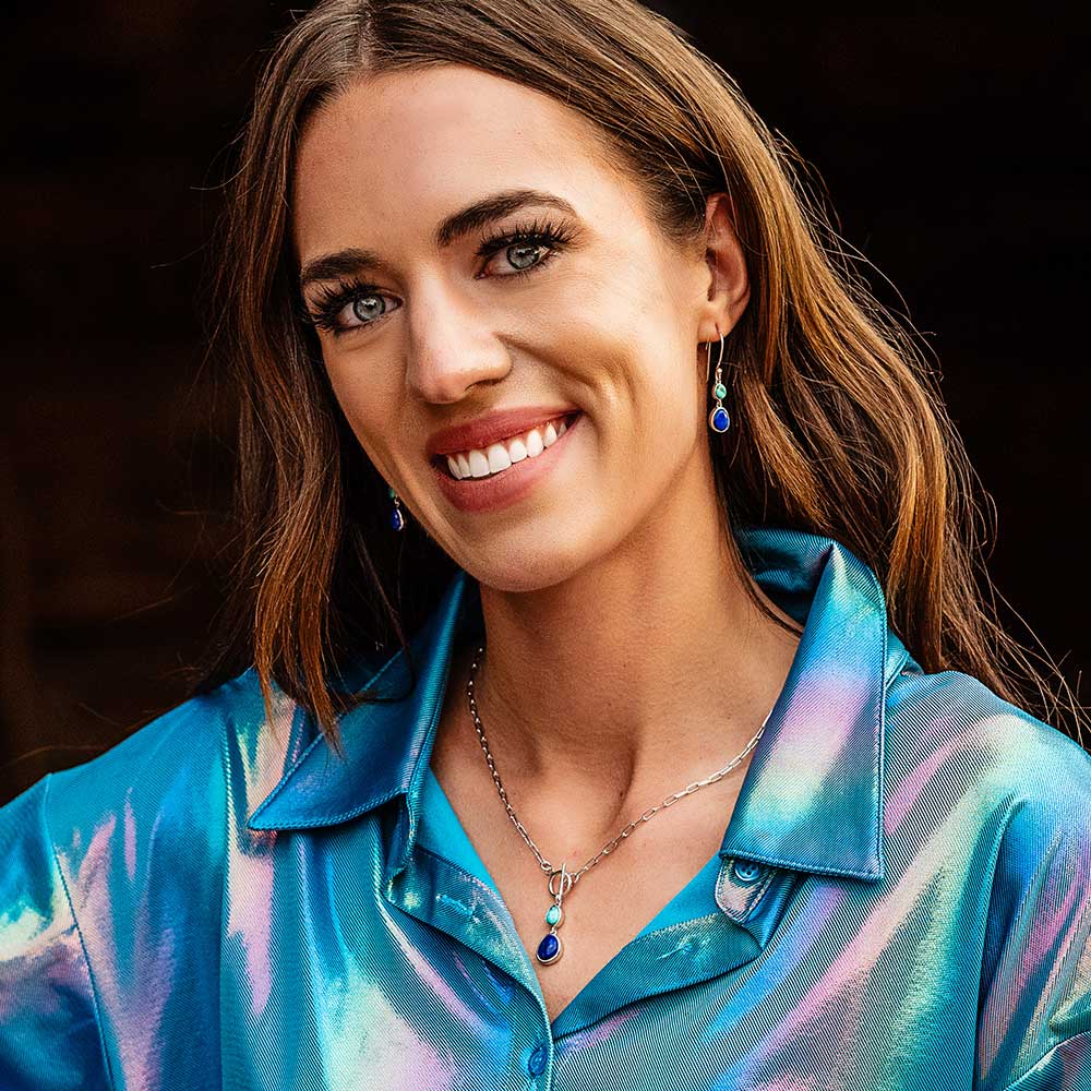 Rhodium plated over brass. Protective coating. Genuine turquoise. Crafted lapis. Rhodium over brass chain. Protective coating.