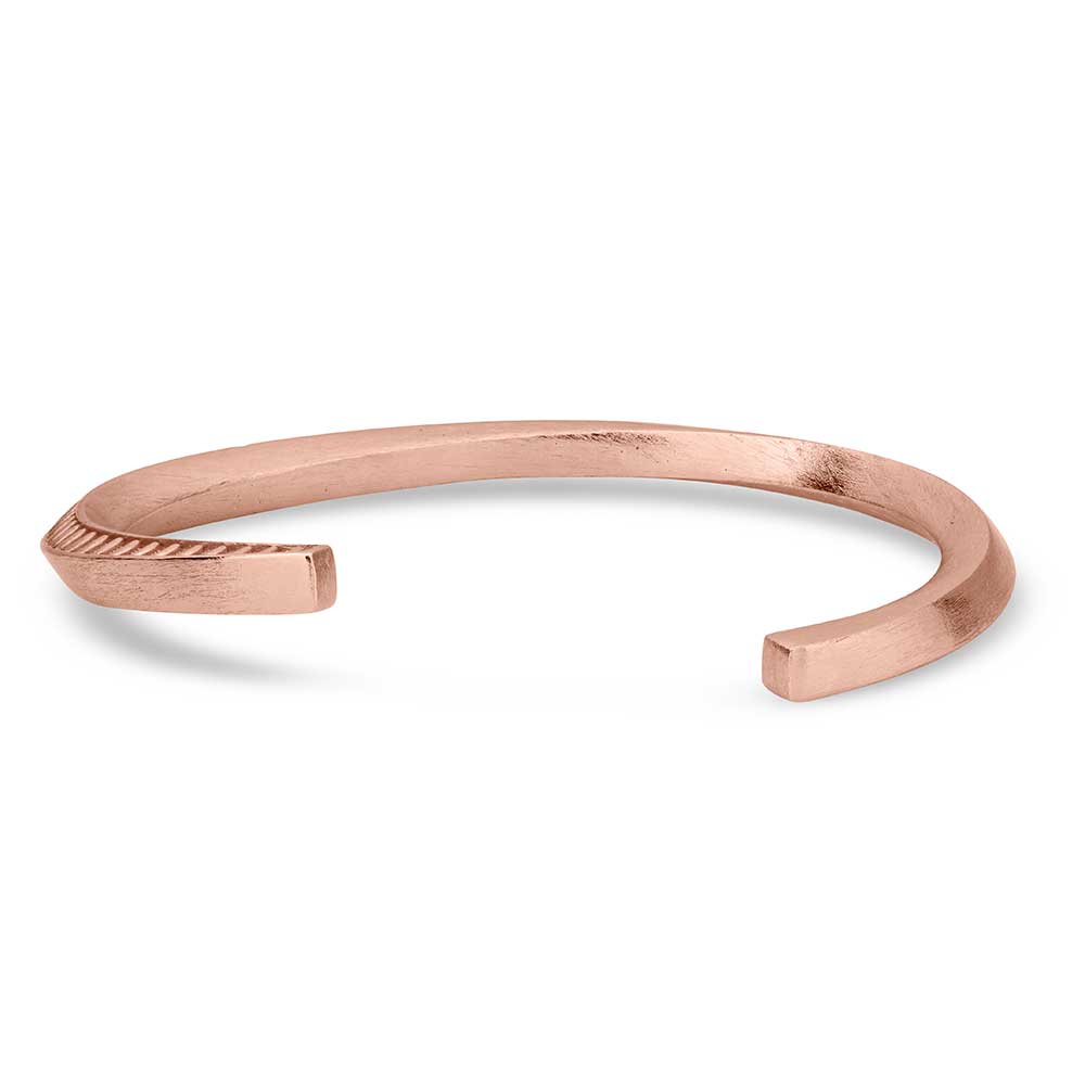 The Twisted Stamped Cuff Bracelet is a simple yet strong design that is perfect for any outing. The copper colored cuff is in a square shape for a unique design that twists around the wrist. One side is stamped with an intricate fan shaped design adding an interesting element to the design. One size fits most.