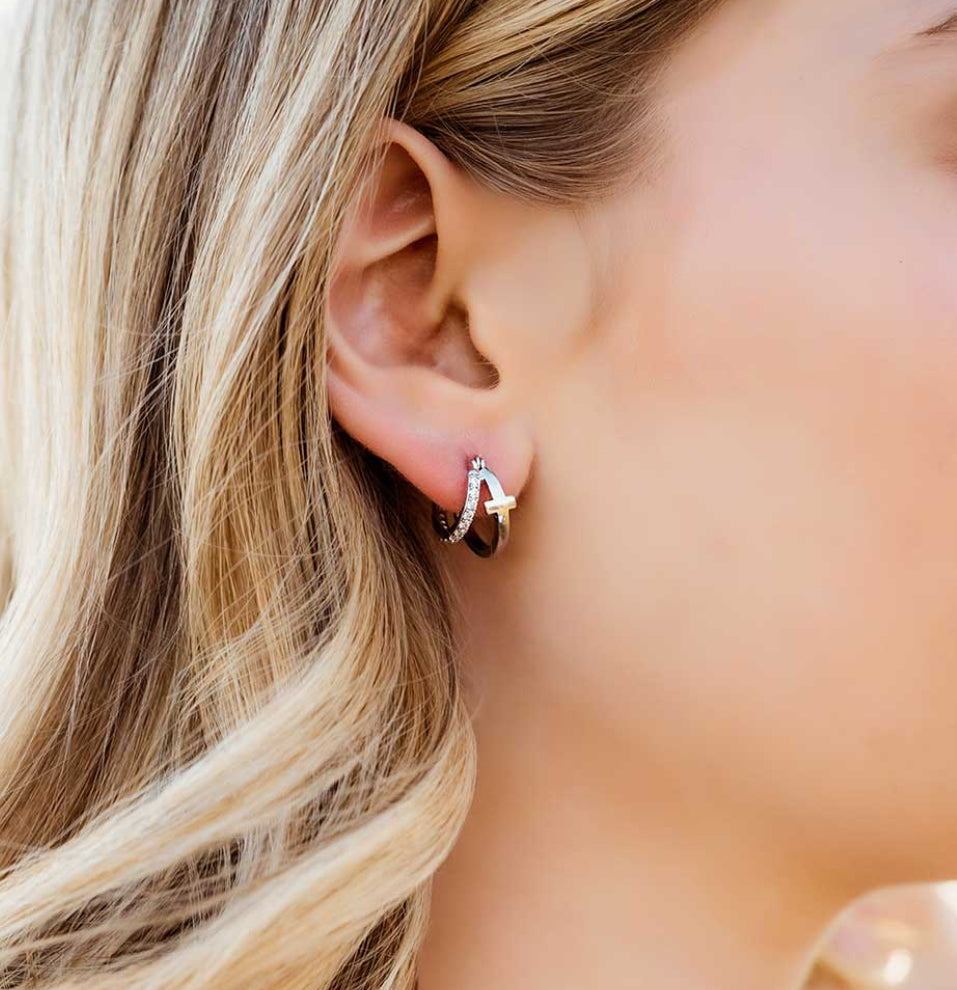 Be forever wrapped in faith with the Wrapped in Faith Crystal Earrings. These unique earrings feature a double ring like design. Two silver finished rings parallel to each other create the design for these earrings. One ring has a smooth silver tone cross design while the other is studded in clear crystal cubic zirconia crystals. This creates a one of a kind design. These earrings feature hypoallergenic latch back closures.