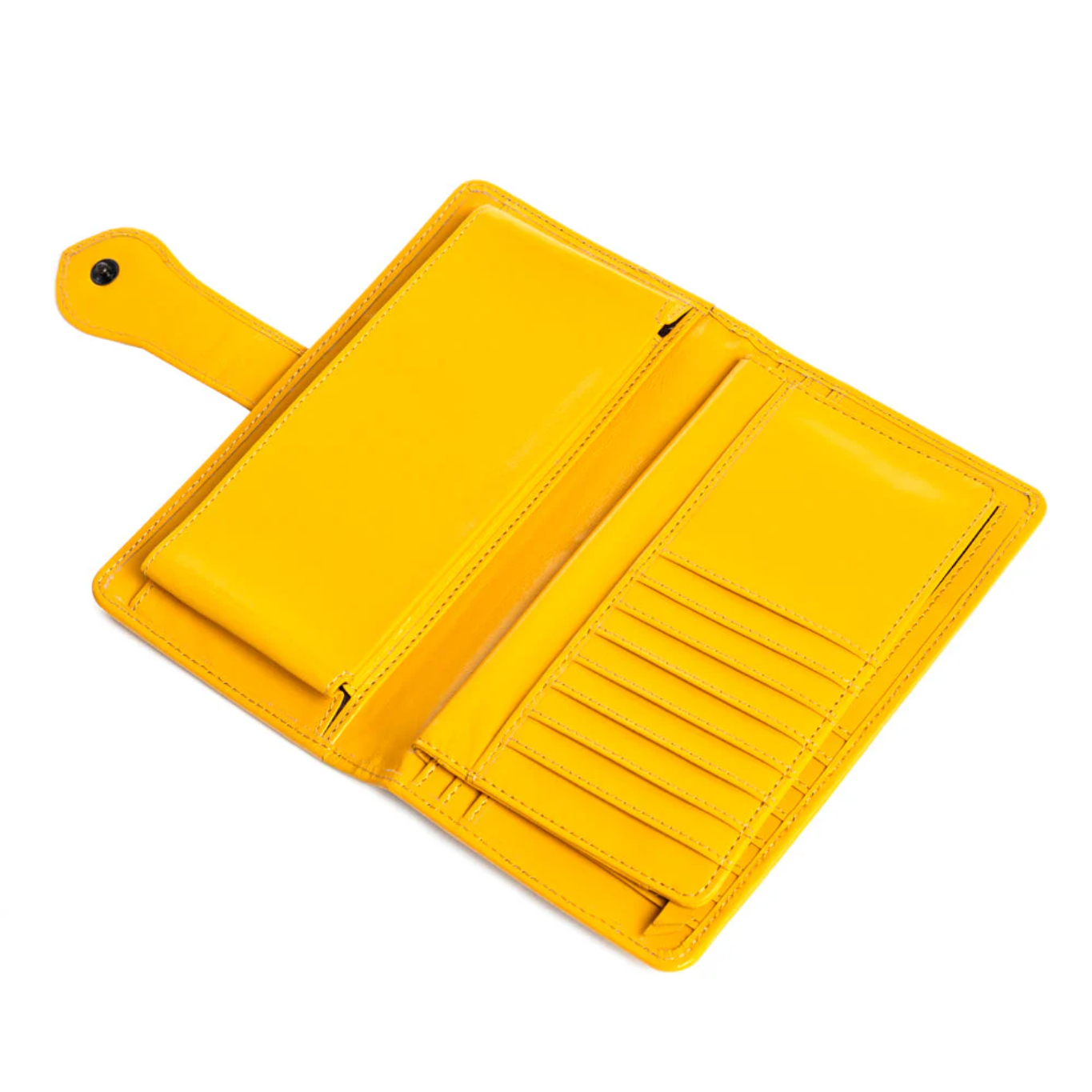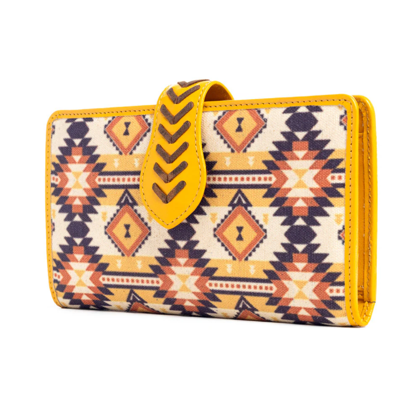 This gorgeous wallet features the amazing upcycled woven canvas of this collection. Expert leather trim in sunrise yellow, all with special stitching, makes for a truly unique presentation. The interior features spacious sections, including a zippered pocket. Snap-close front flap. Truly a spectacular wallet for your collection!