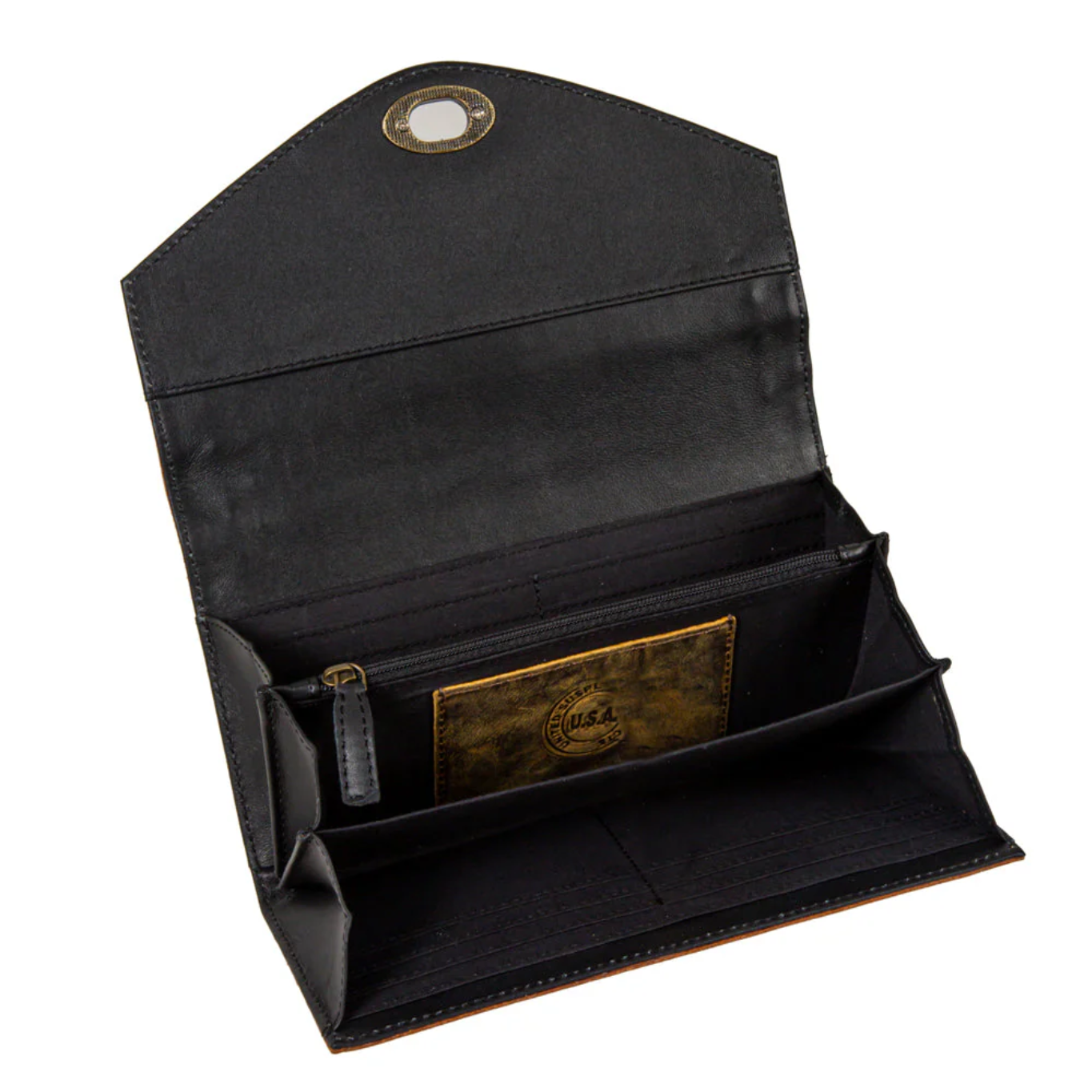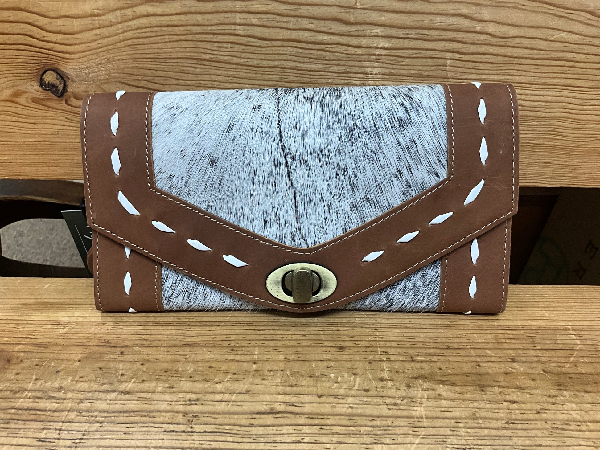 The delightful wallet has the unique styling that’s part of our Oxbow Falls collection. Warm caramel leather with special stitching frames the hair-on hide flap, which features a lock button closure. The interior features plenty of room for cards, IDs, and other other important items. A great addition to any collection!
