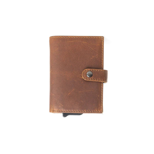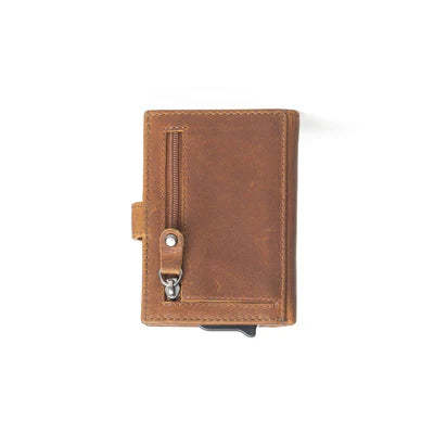 You'll love this compact wallet, where style meets security! Crafted from supple caramel brown leather with elegant contrast stitching, this sleek accessory features an innovative inner metal pop-up compartment with RFID protection. Effortlessly organize your cards and cash while safeguarding your personal information in chic, minimalist style. Back has an extra zippered pocket for convenience.