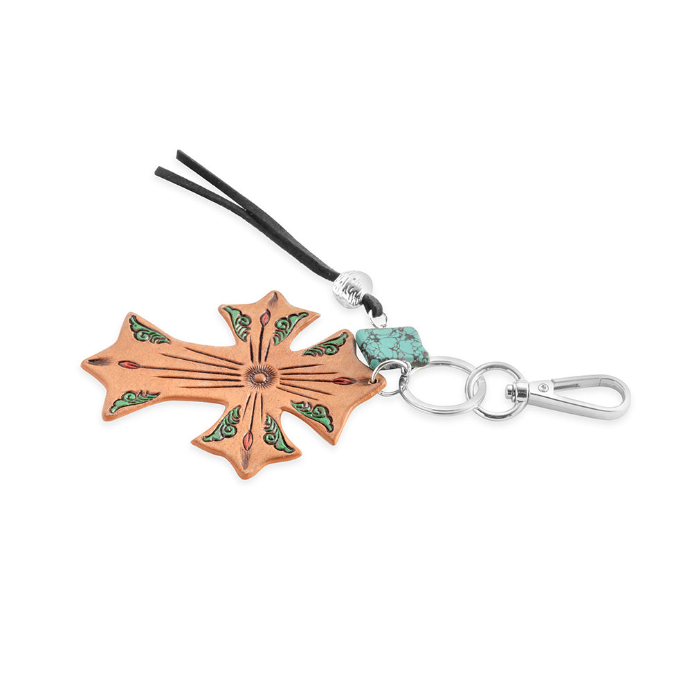 Express your faith with our Western-inspired leather cross key fob, adorned with turquoise scrollwork, genuine stone accent, and decorative leather tassel