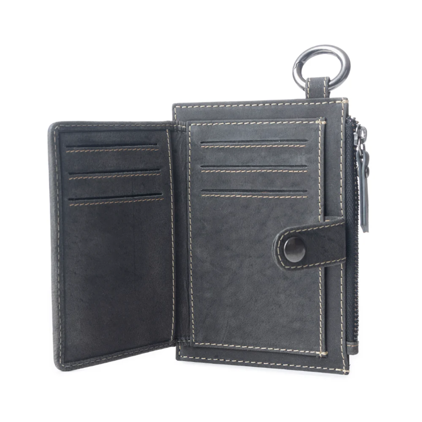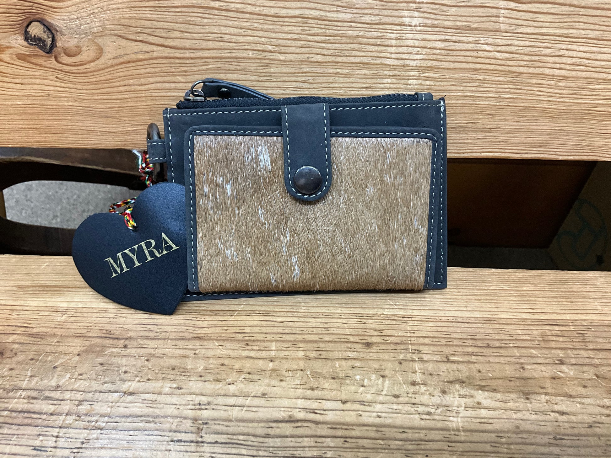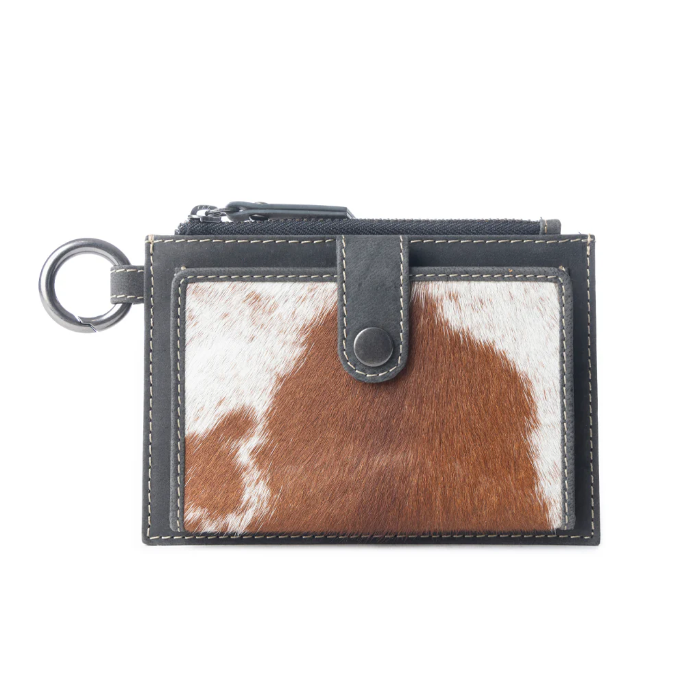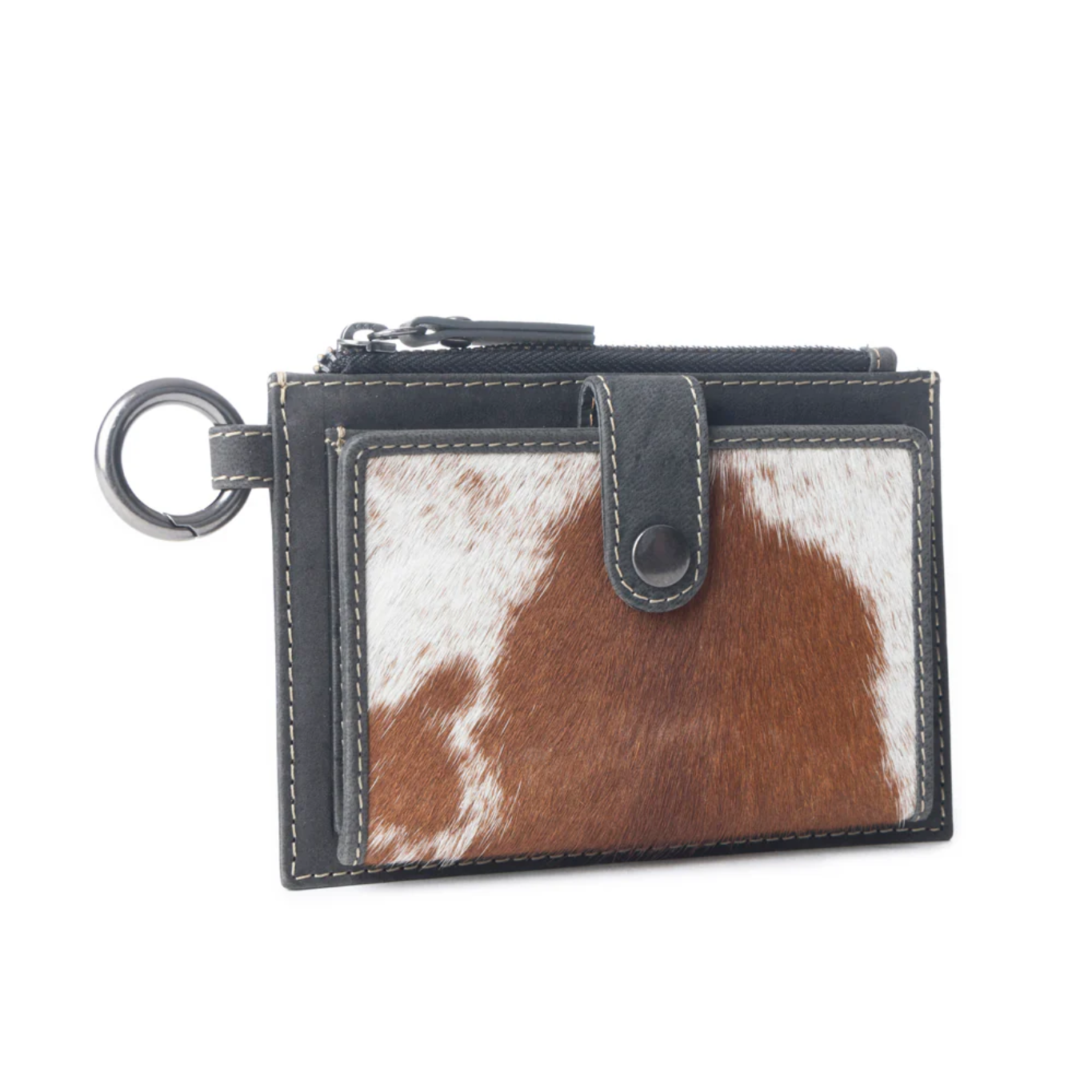 Embrace minimalist Western style with this compact card keeper, featuring authentic hair-on hide framed by desert-worn leather. Perfect for the modern trail blazer, this mini-wallet combines ranch-inspired design with city sophistication. The secure snap closure and handy key ring keep your essentials close at hand.