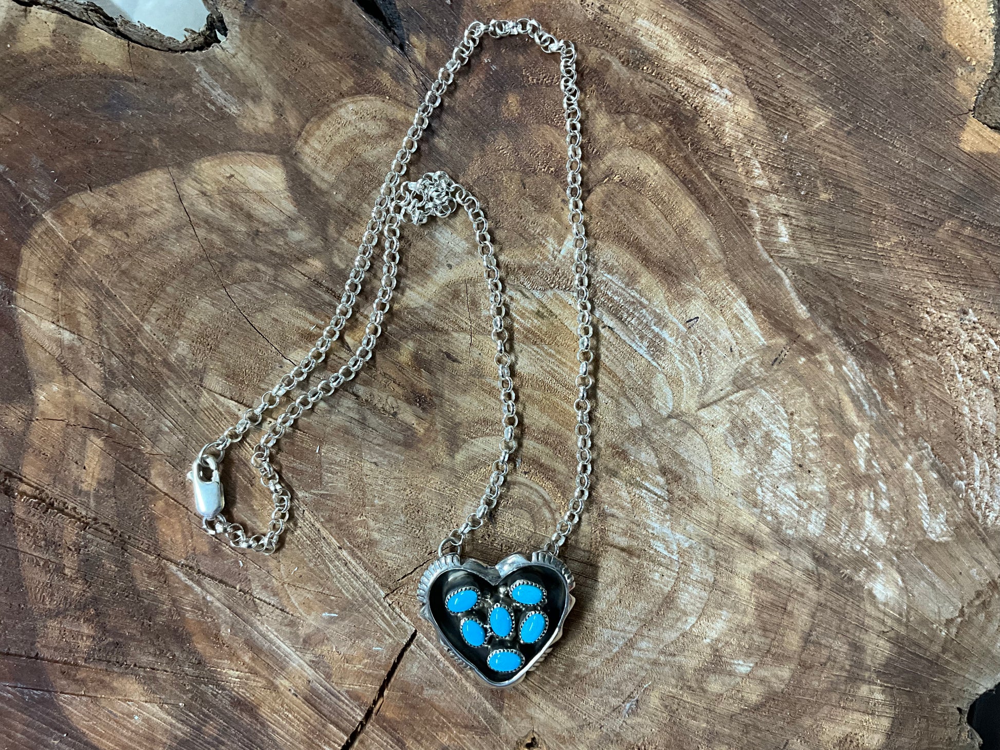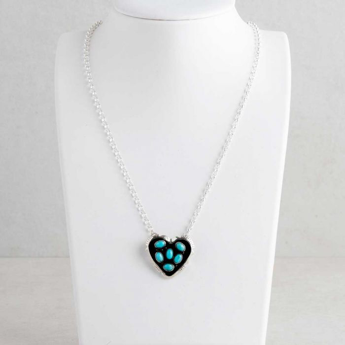 This heart-shaped necklace is a sure conversation starter. Featuring bright blue Kingman Turquoise and delicate silver drops.