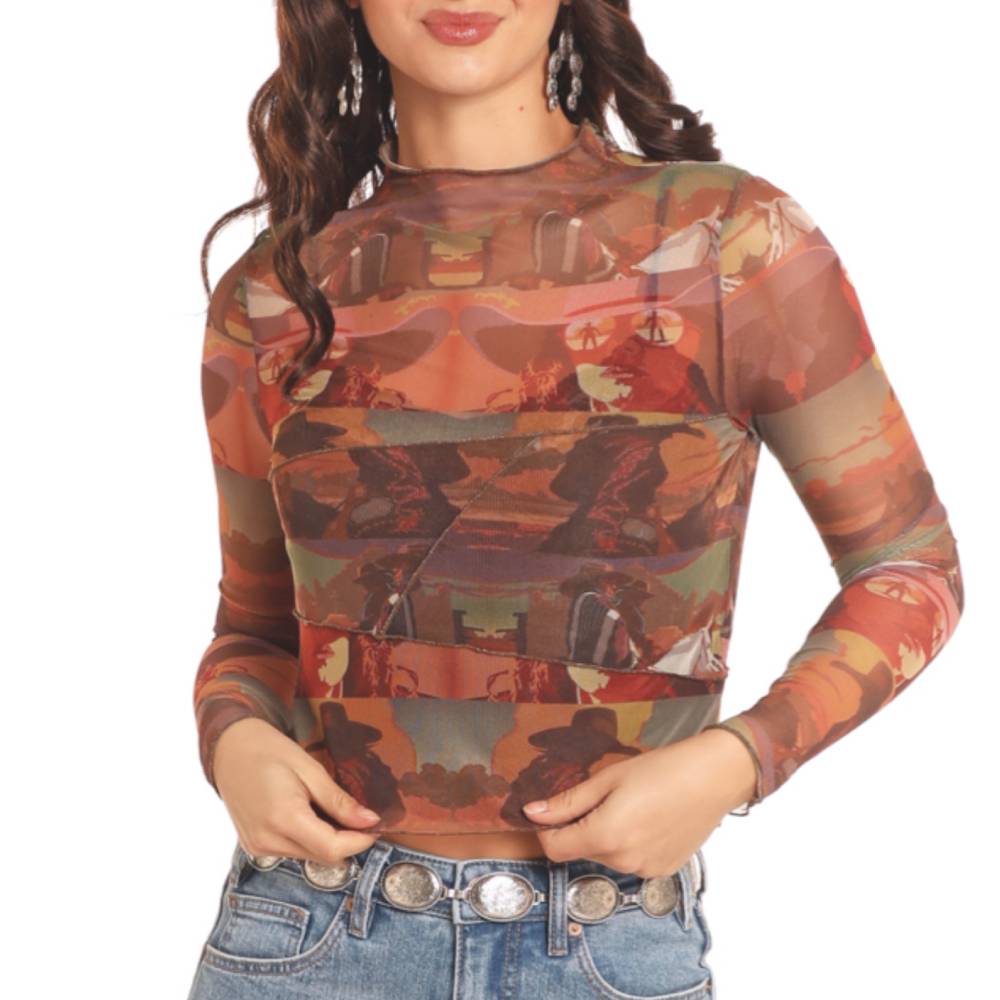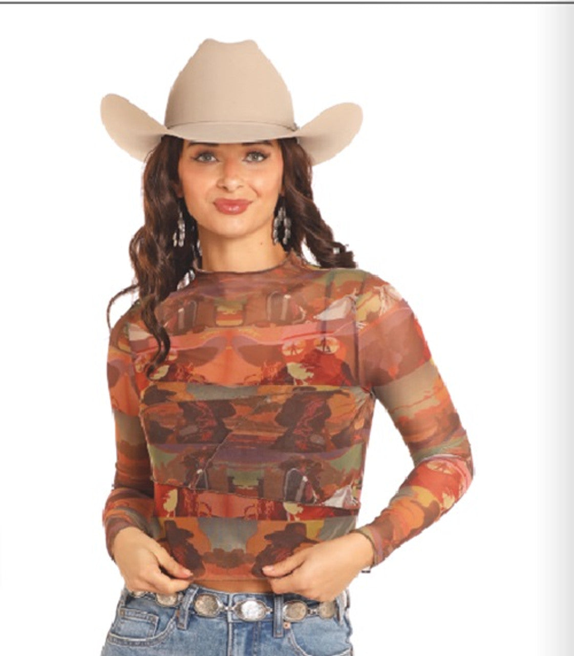 Style your look with our Rock & Roll Denim Women's Western Scene Mesh Top! This multi-colored top features a stunning western scene print all over, while the full mesh top provides a touch of allure. Made with a blend of polyester and spandex, this long sleeve top offers both comfort and style in one. Don't miss out on this must-have piece for your wardrobe!