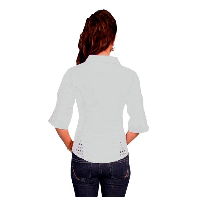 White 100% peruvian cotton 3/4 sleeve blouse. It features a button front with loop closures point collar with floral vine soutache design on front and sleeves. Discreet comfort panel on sides. Crochet insets on bottom and cuffs. Machine wash cold and hang dry. Import.