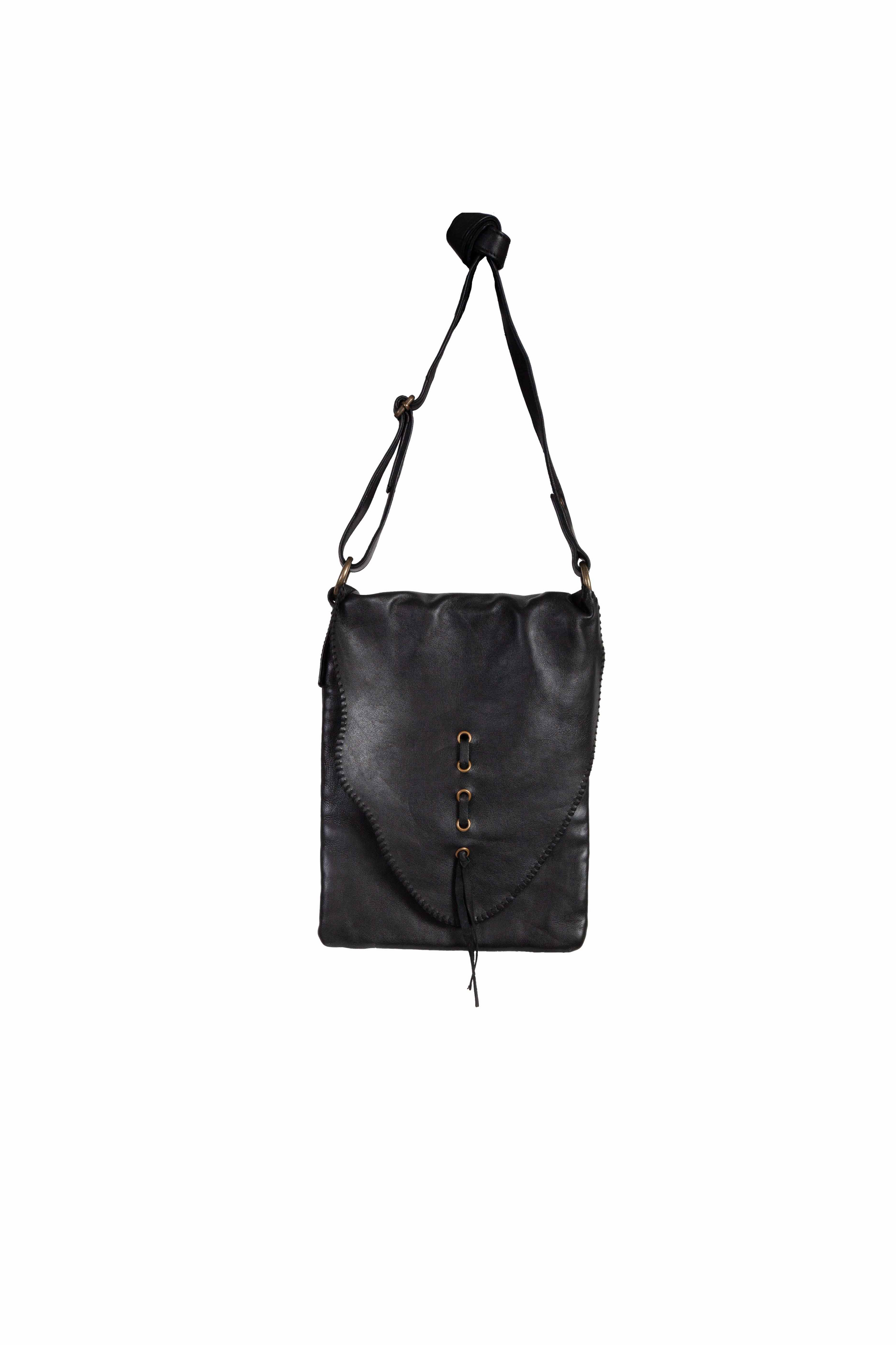 - This handbag features a natural edge flap with whip stitch trim and center groomets with leather lacing.