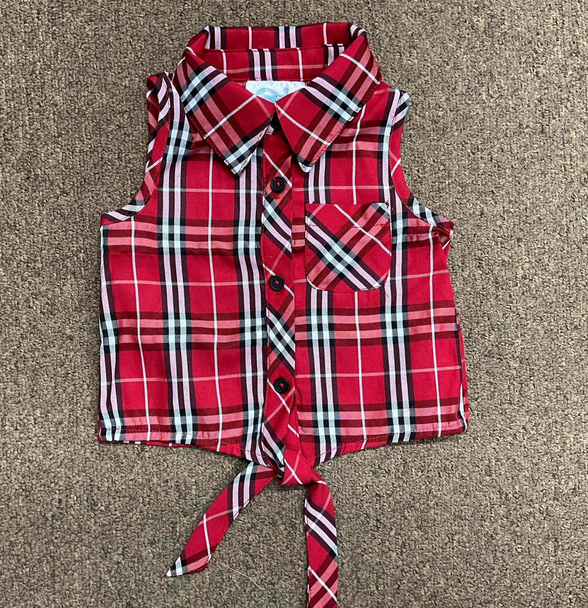 Red Plaid Sleeveless Shirt with Tie at Waist