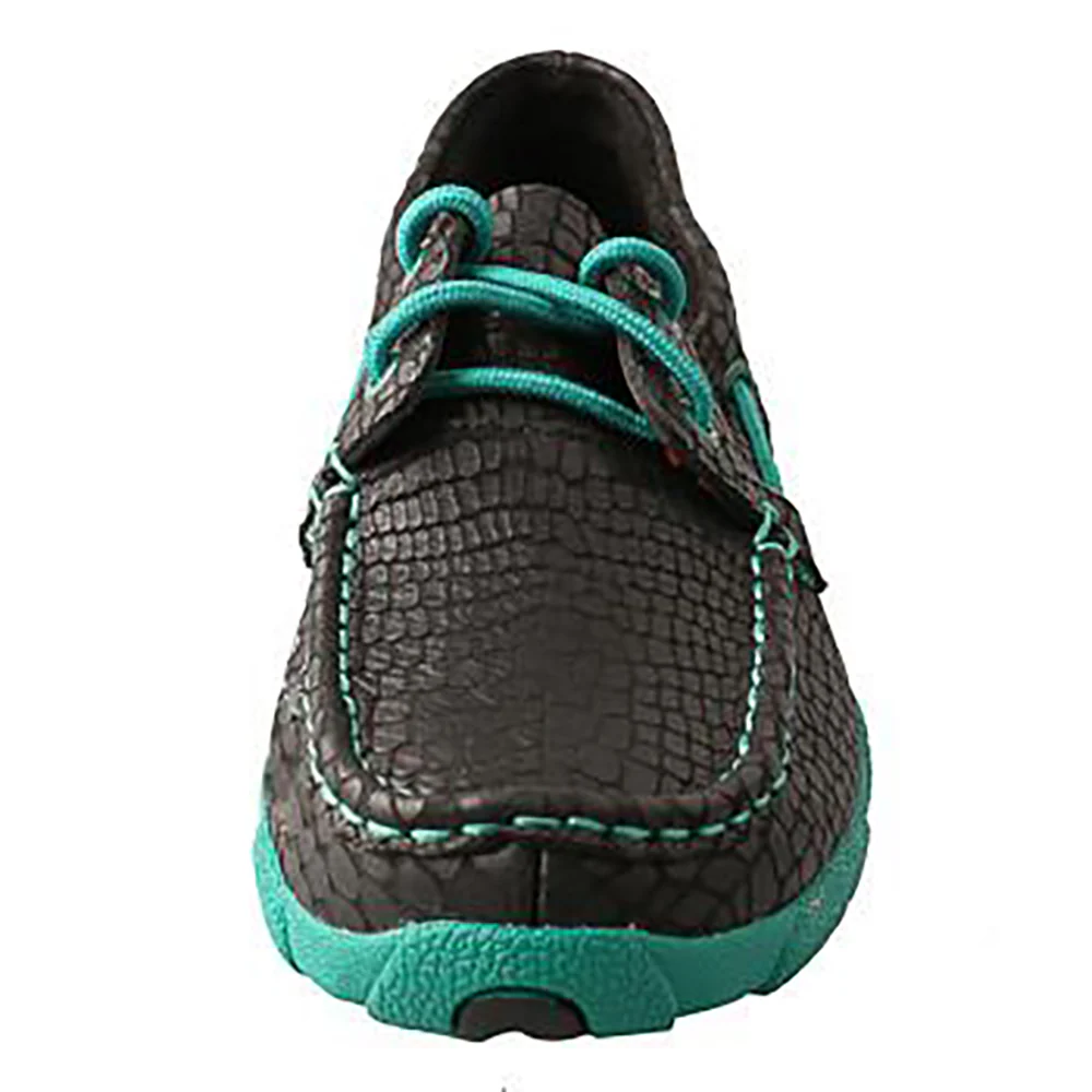 Twisted X Women's Black Leather Croc print with lush green lacing. You can now have a black shoe from your favorite casual shoe brand! This is not only fun, it's also comfortable and durable and offers the antibacterial insole.