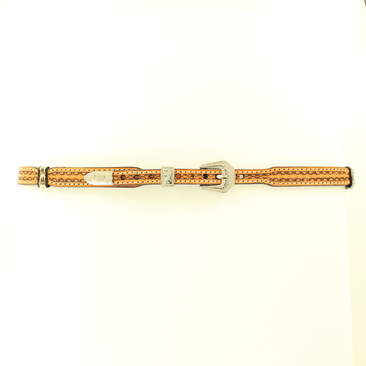 This western hatband by M&F Western Products will definitely set off the western look on your favorite hat. It features a tan, tooled, scalloped 1/2 tapered strap with ribbon wraps. This hatband uses a belt style adjustment with a rounded silver buckle.