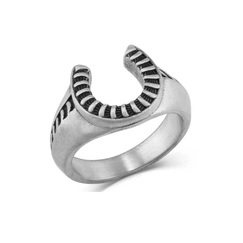 The Striking Edge Lucky Horseshoe Ring is a strong design with brushed stainless steel for a muted and darker look. An open horseshoe sits in the center of the ring with an etched edge that shows strength and adds interest to the design.