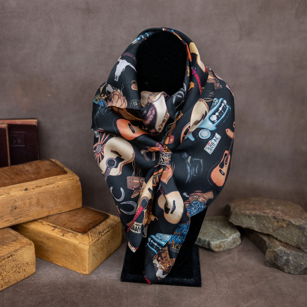 The perfect addition to your wild rag and collection. This design offers functionality and style. Available in a 34"x 34" size, you can style this wild rag with a classic knot or slide, wear as a headband or belt, or tie to your purse for a custom accessory.