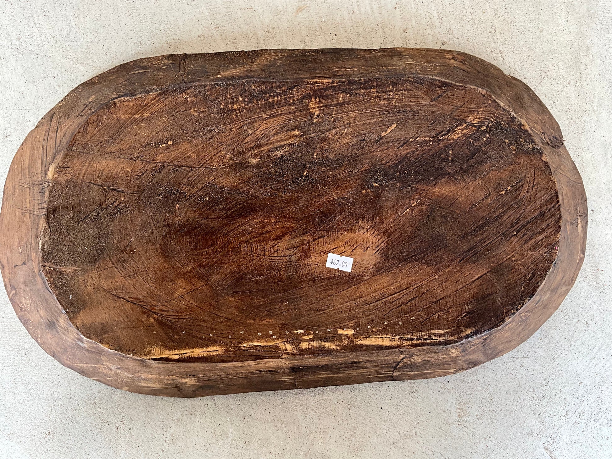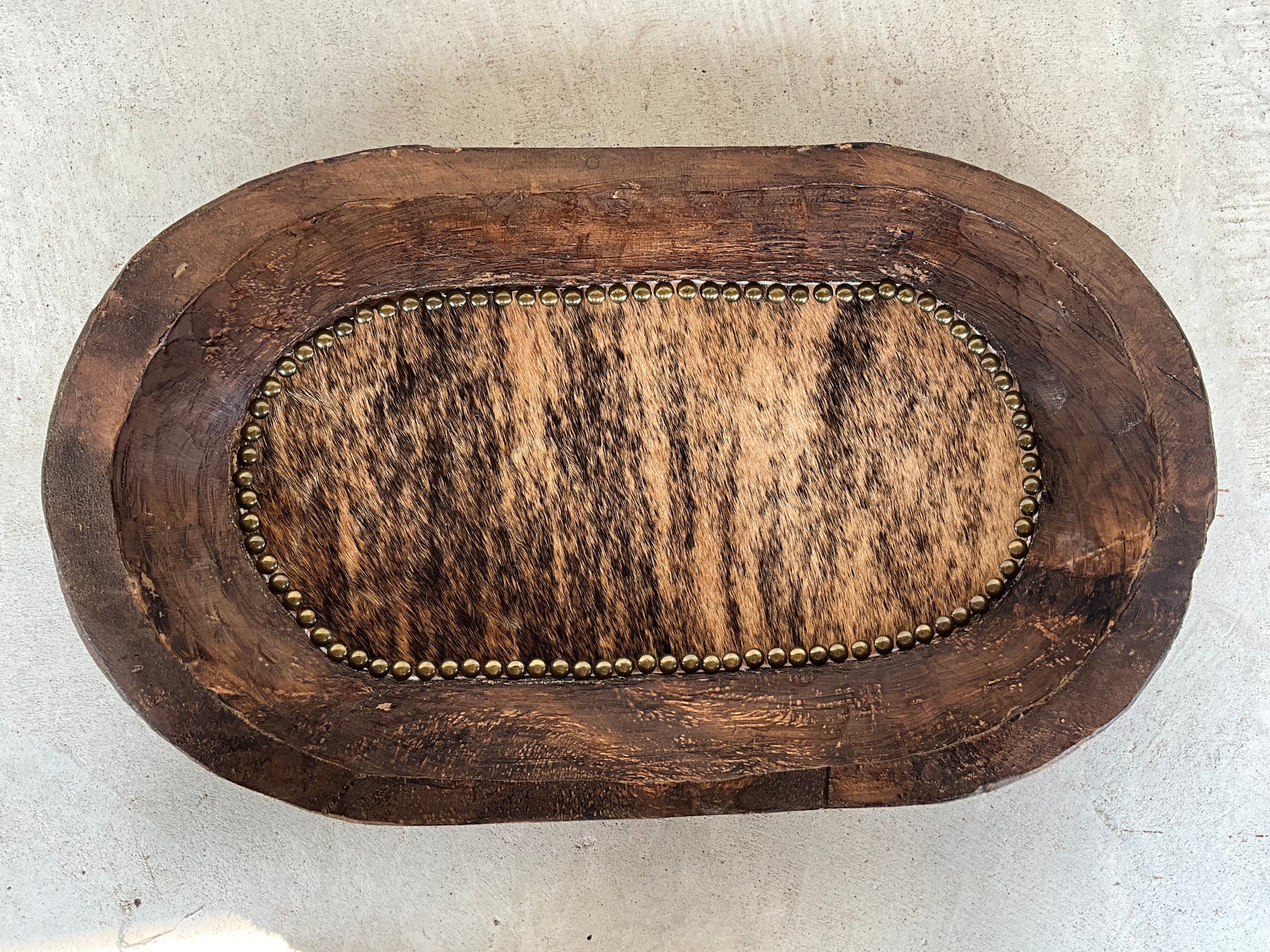 11 1/2” x 22” wooden bowl with cowhide