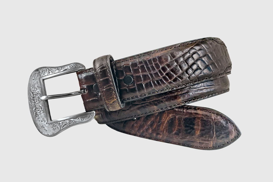 Croco print leather strap with matching end tabs, padded with feathered edge. 7 point end holes for “Better Flt” across all body types.