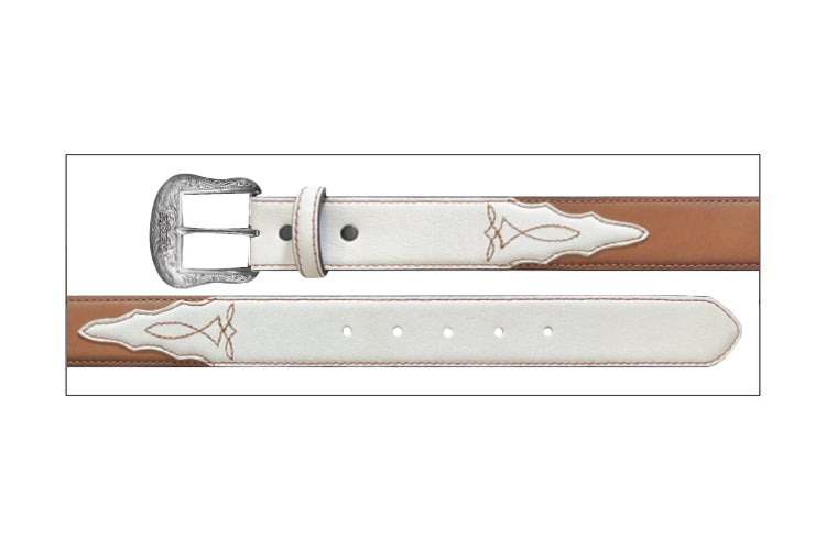 Genuine leather belt with single tonal stitched edges, white end tabs with contrast toe bug stitch and Wrangler buckle in silver finish.