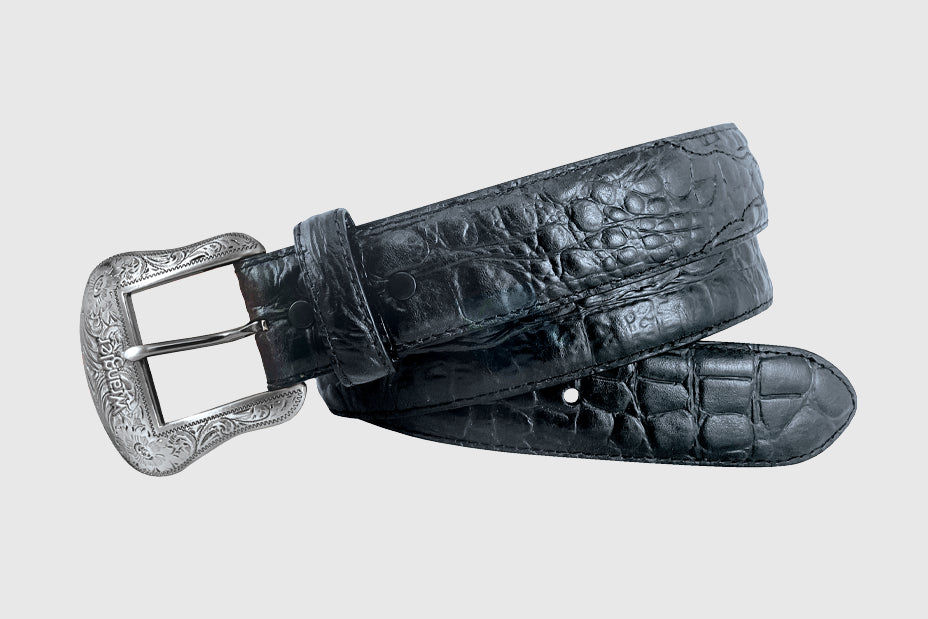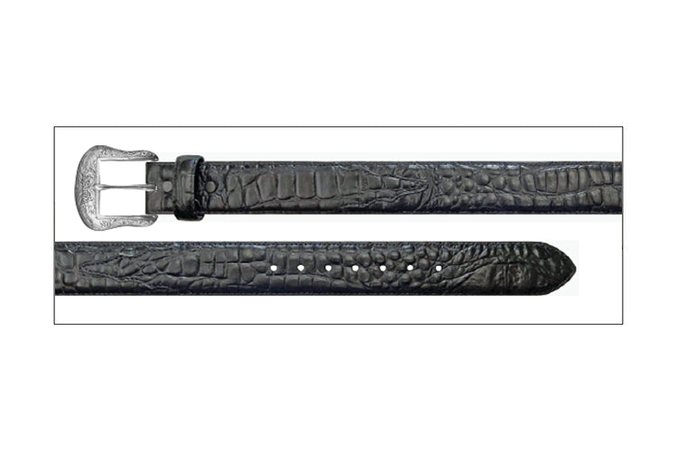 Croco print leather strap with matching end tabs, padded with feathered edge. 7 point end holes for “Better Flt” across all body types.