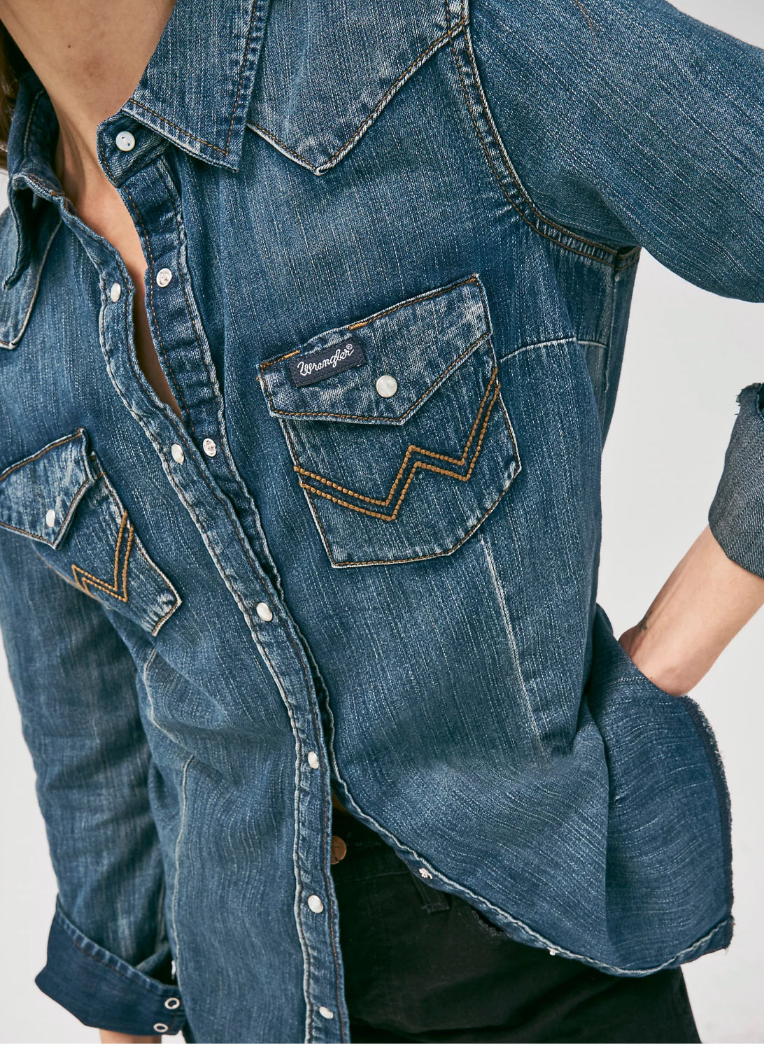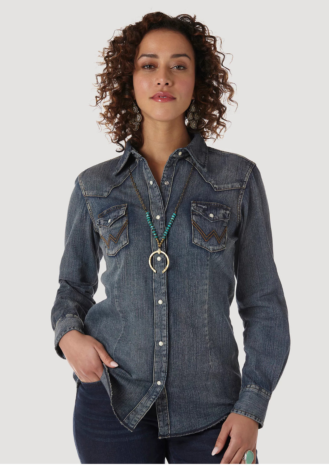 Wrangler WOMEN’S LONG SLEEVE WESTERN SNAP DENIM TOP IN DENIM LW3039D